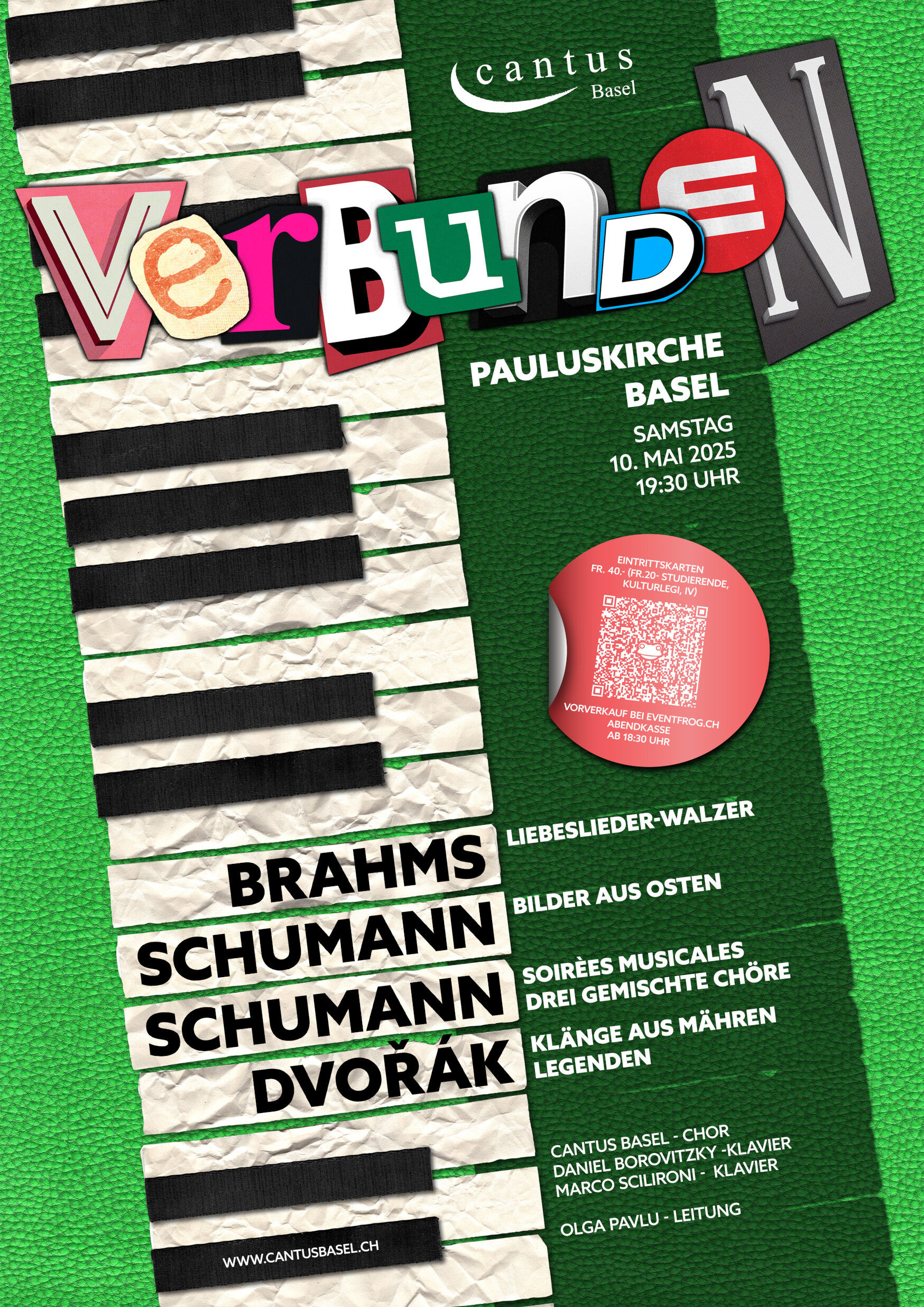 VERBUNDEN - Werke von Antonín Dvořák, Clara Schumann, Robert Schumann, Johannes Brahms. Gesungen von Cantus Basel, gespielt von Daniel Borovitzky und Marco Scilironi, geleitet von Olga Pavlu.