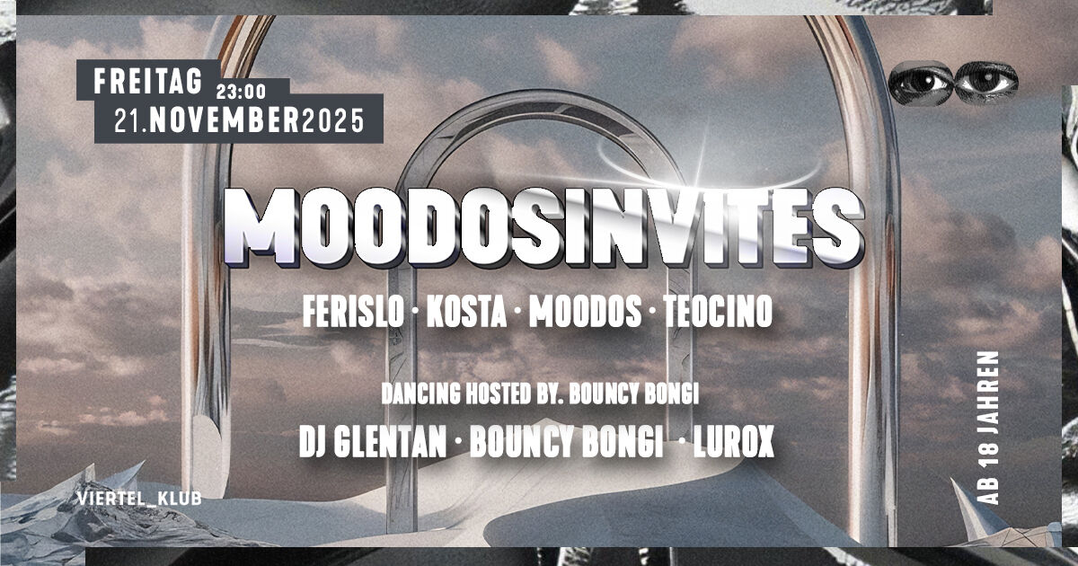Das junge Basler DJ-Duo MOODOS, bestehend aus Avio und Leo Rustemi, verzückt seit geraumer Zeit mit seinen Sets das lokale Nachtleben. Mit ihrem eigenen Event "Moodosinvites" ginge sie den nächsten Schritt und blicken bereits auf zwei ausserordentlich erfolgreiche Episoden zurück. Nun schreiben die beiden das 3. Kapitel und wiederum laden sich die beiden Gastgeber, befreundete, lokale Artists ein und übernehmen gemeinsam die musikalische Gestaltung der Nacht. Und um dem bisherigen Erfolgsrezept treu zu bleiben, bleibt der Eintritt ab 18 Jahren.