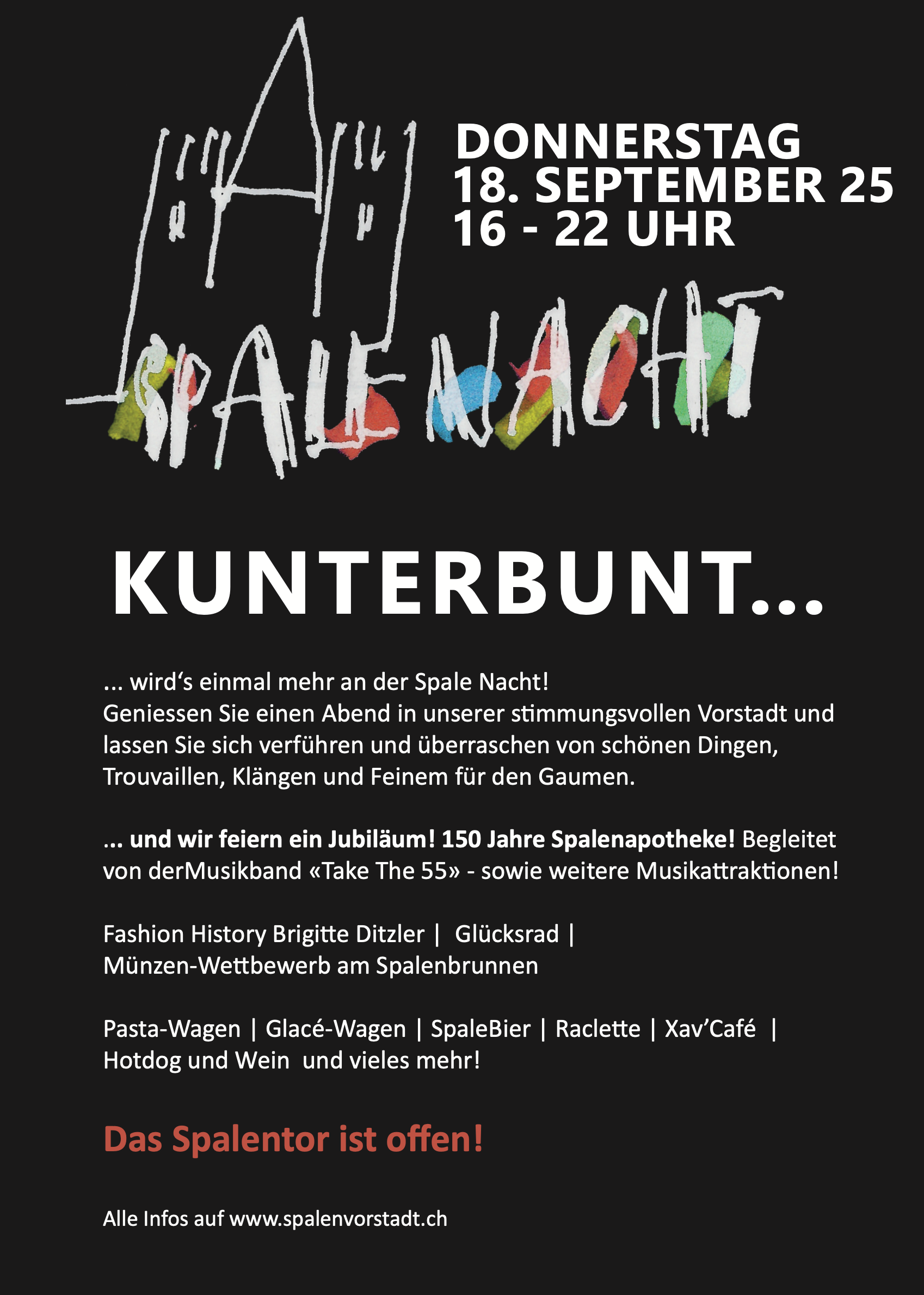 Am Donnerstag, 18. September 2025 von 16 bis 22 Uhr verwandelt sich die Spalenvorstadt erneut in eine pulsierende Strasse. Die SpaleNacht wird organisiert von der IG Spalenvorstadt und bietet ein kunterbuntes Programm für Jung und Alt.