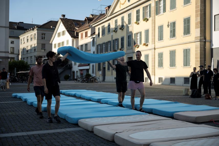 Seit ihrer Gründung 2012 in Luzern verbindet die internationale Compagnie Trottvoir auf innovative Weise Zirkus, Theater und Musik, kreiert unvergleichliche Produktionen im öffentlichen Raum und erreicht damit ein ganz diverses Publikum – von Kulturaffinen bis Kulturneulingen. Mit FLÄZEN präsentiert sie ein kraftvolles Plädoyer für das Innehalten: Die rund 90-minütige Performance lädt das Publikum ab 12 Jahren dazu ein, sich gemeinsam mit der Compagnie auf eine grosse Liegefläche aus 60 Matratzen mitten in der Stadt zu legen – und nichts zu tun. Ausgestattet mit Kopfhörern, Mikros und Instrumenten nimmt die Compagnie die Liegenden mit auf eine Reise – vom gehetzten Alltag zu einer kollektiven und gelasseneren Form des Daseins: FLÄZEN.