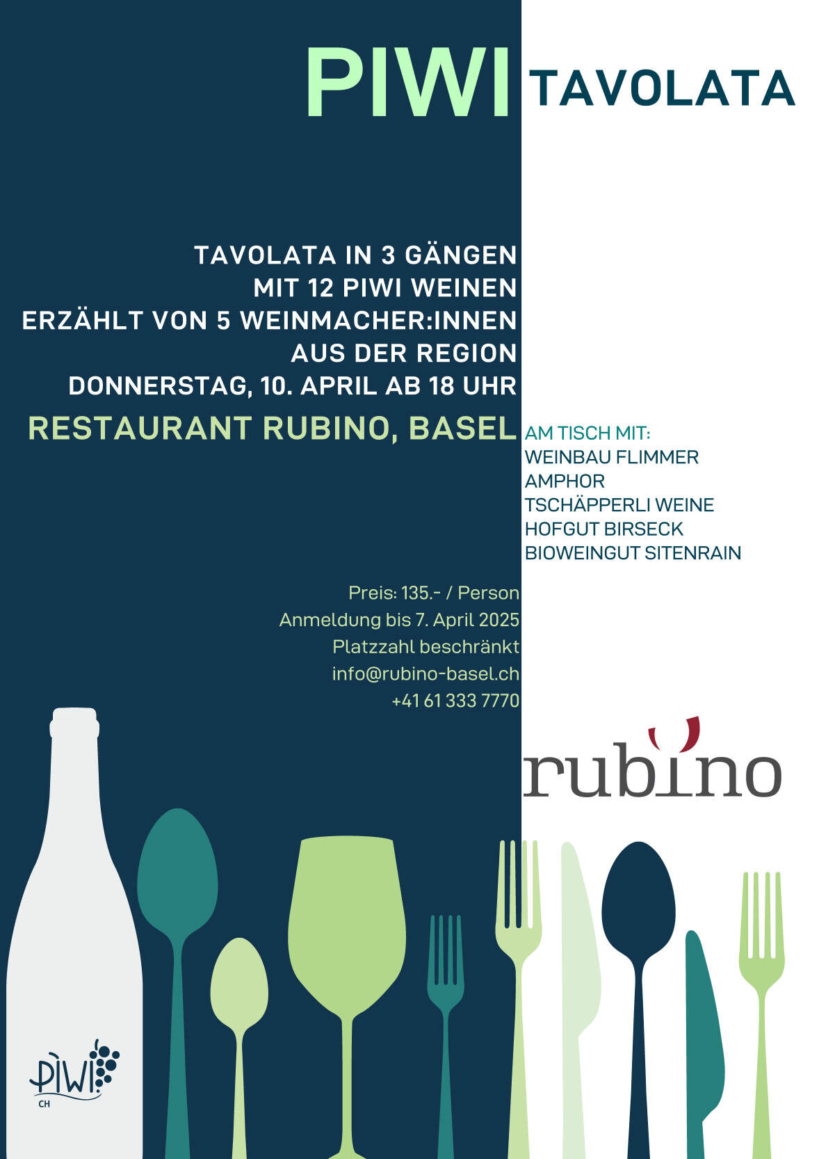 Tavolata in 3 Gängen mit 12 PIWI Weinen erzählt von 5 Weinmacher:Innen aus der Region. Am Tisch mit Weinbau Flimmer, Amphor, Tschäpperli Weine, Hofgut Birseck und Bioweingut Sitenrain.