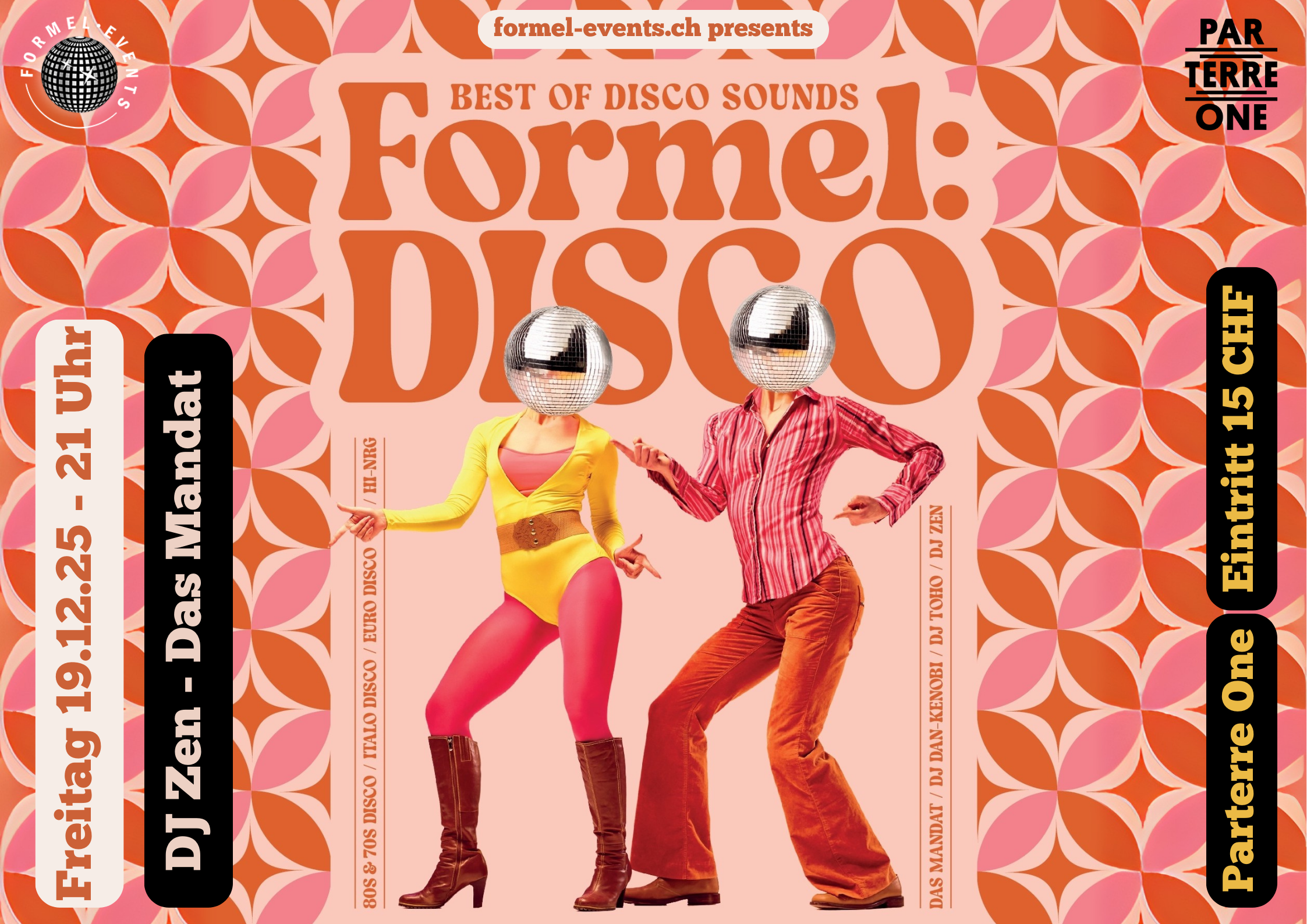 Mit Formel:DISCO zelebrieren wir die Disco Musik von Mitte 70er bis heute. DJ Zen & Das Mandat bieten euch einen abwechslungsreichen Mix durch die verschiedenen Arten von Disco, wie Disco-Funk, Disco-Pop, Disco-House, Nu Disco, Euro- und Italo-Disco, Hi-NRG.