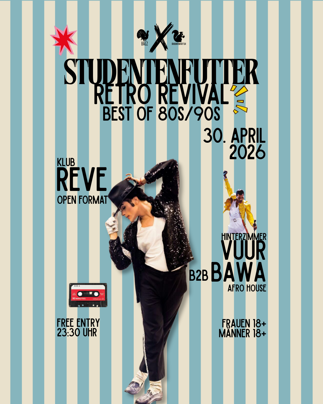 Studentenfutter – Retro Revival. Die besten Sounds der 80s & 90s treffen auf eine Nacht voller Vibes und Energie.