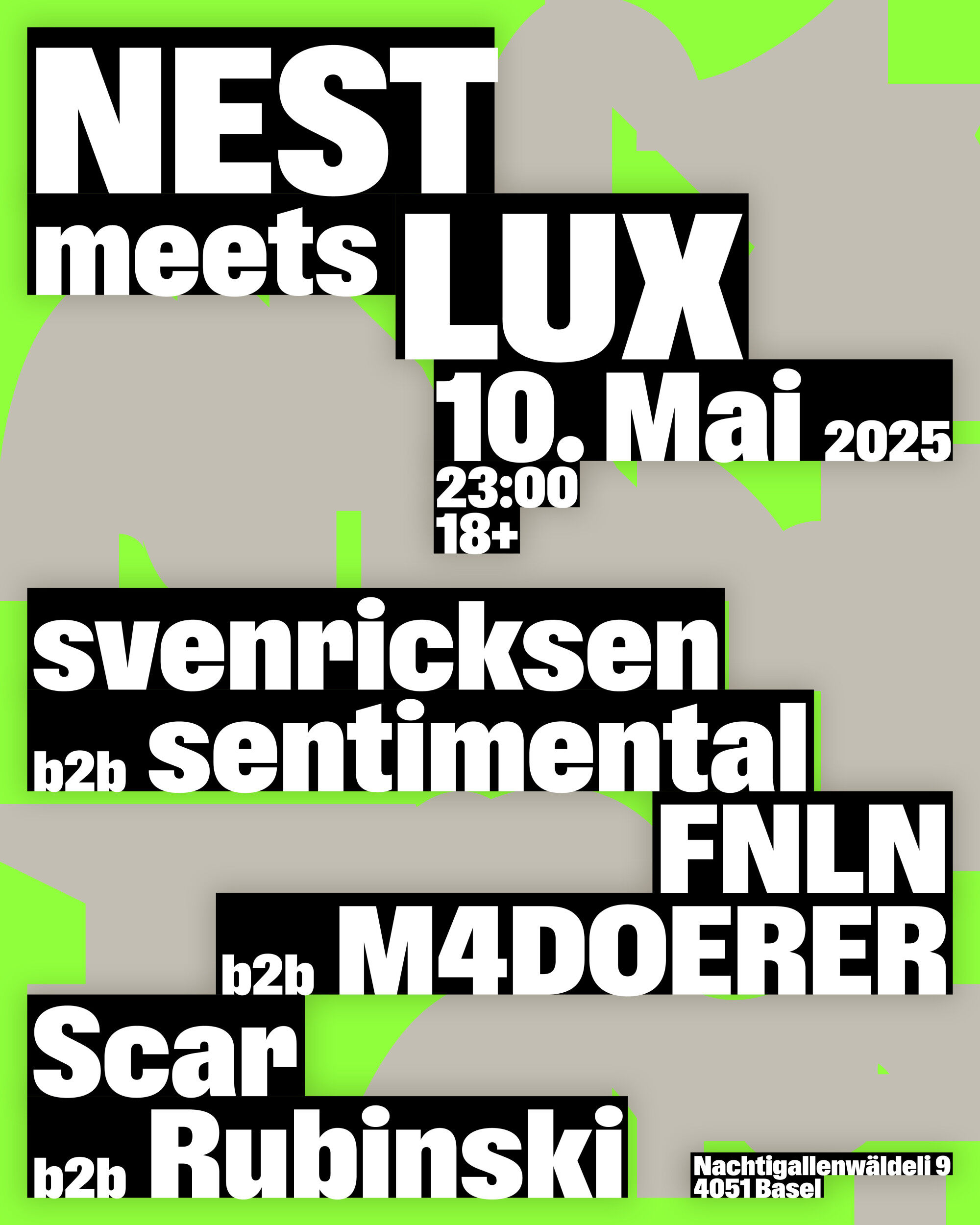 Tiefe Bässe, treibende Hi-Hats und kraftvolle Synths prägen die Klangwelt, die das LUX kollektiv am 10. Mai ins Nest bringt. Auf dem Programm stehen zwei B2B-Sets unserer LUX-Residents – den krönenden Abschluss liefert ein energiegeladenes B2B von Scar und Rubinski.