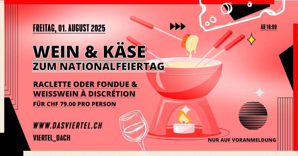 Zur Auswahl stehen Raclette oder Fondue – beides à discretion und auf Vorbestellung für nur 79.- CHF pro Person. Dazu schenken wir ausgewählte Schweizer Weine aus, ebenfalls à discretion. Alles in einem stimmigen Paket für einen langen Sommerabend.