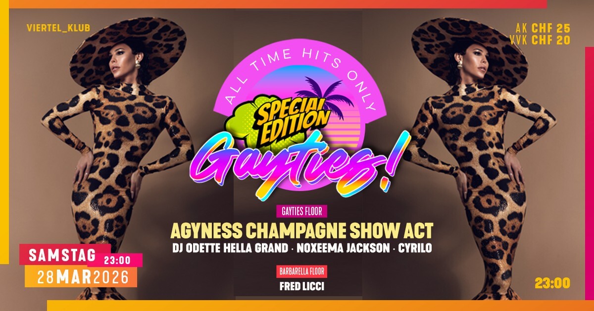 Zwei Floors, maximale Ekstase: Auf dem Gayties Floor feiern Odette, Noxeema und Cyrilo mit euch die größten All Time Hits, queere Classics und unvergessliche Party-Hymnen. Mitsingen, durchtanzen, loslassen. Im Rüümli bringt Fred Licci auf dem Barbarella Floor mit treibenden elektronischen Sounds den Dancefloor zum Glühen.
