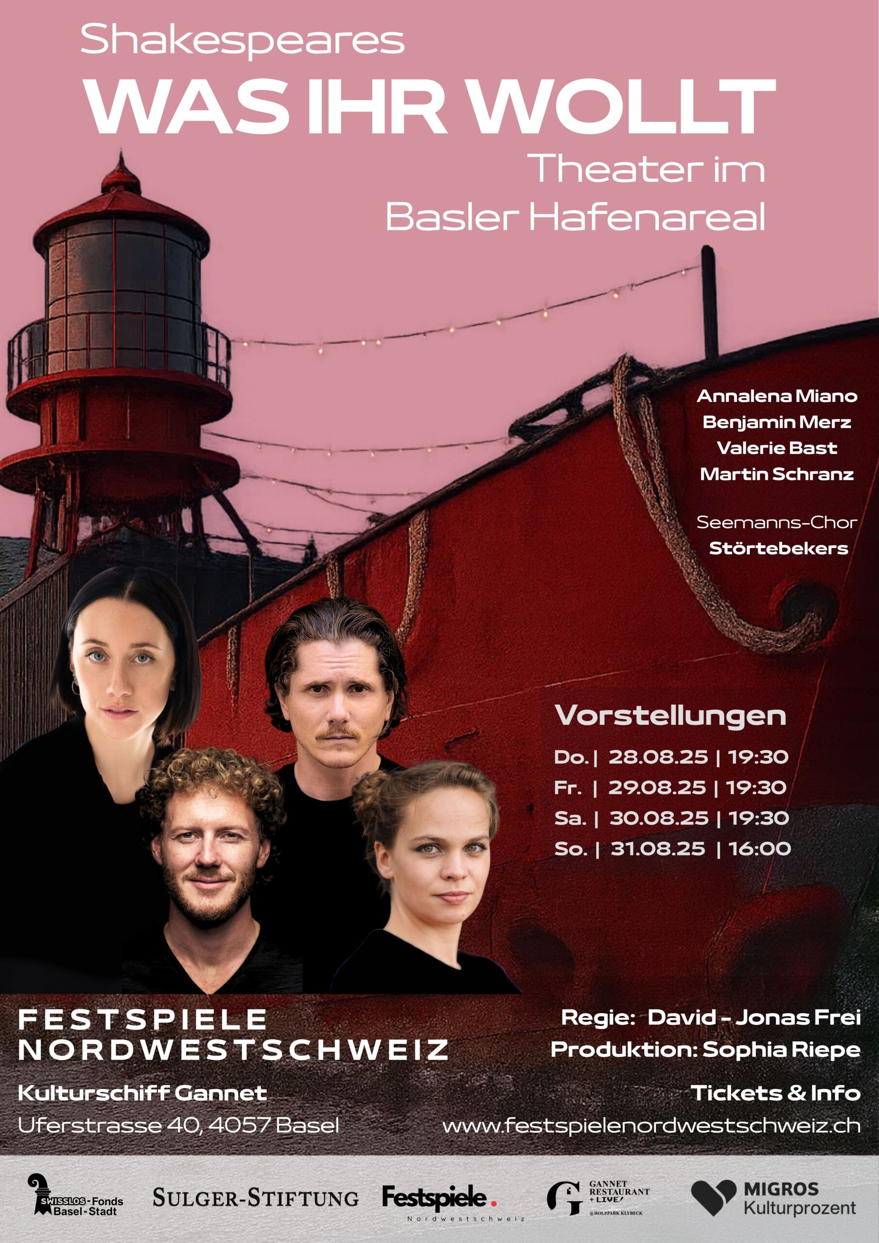 Ein Sturm. Ein Schiff. Eine Insel. Stranden Sie mit uns in Illyrien – einem Ort zwischen Masken, Rollenverwechslung und Begegnungen. Viola überlebt das Unglück knapp, und wird als Junge verkleidet zur Vertrauten des Herzogs. Für Ihn soll sie um seine grosse Liebe Gräfin Olivia werben. Doch wie so oft macht die Liebe was sie will. Die Inszenierung nutzt Innenräume und Deck der GANNET, Chor und Musik begleiten das Geschehen. Der Basler Seemannschor stimmt ein, das Ensemble erzählt. Der Dampfer liegt fest verankert – und trägt doch weit hinaus.