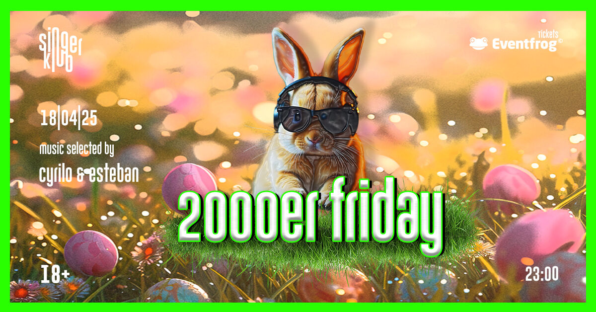 erlebe den 2000er friday am karfreitag speziell zu ostern mit den größten hits der 2000er. die djs cyrilo und esteban in doppelpower bringen die besten tracks dieser ikonischen ära auf die tanzfläche. genieße eine nacht voller nostalgischer beats und unvergesslicher momente und dem ein oder anderen "easter egg",- der osterhase bringt uns sicher eine prächtige ladung guter hits!