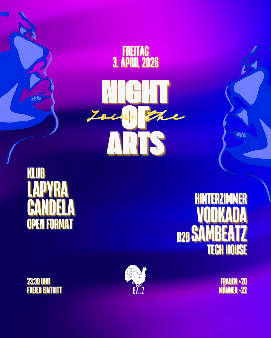 Night of Arts – Beats, Vibes und pure Energie. Open Format im Klub, treibender Tech House im Hinterzimmer. Dance. Feel. Repeat.