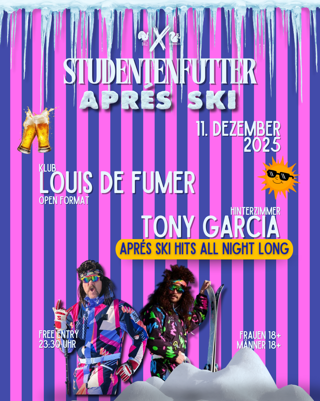 Im Klub sorgt Louis De Fumer mit einem wilden Open-Format-Mix dafür, dass niemand lange stillsteht – Hits, Hüttengaudi und alles, was man nach zwei imaginären Abfahrten unbedingt hören muss.