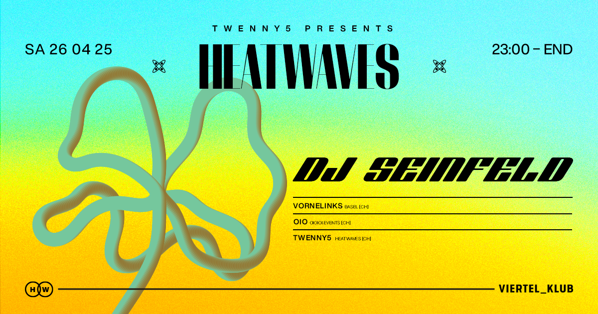 Als Hauptact begrüßen wir den schwedischen Produzenten und DJ DJ Seinfeld. Bekannt für seine einzigartige Fusion von Acid House, Deep House und Lo-Fi-Sounds kreiert DJ Seinfeld eine Atmosphäre wie kein anderer. Mit Alben wie Time Spent Away From U (2017) und Mirrors (2021) hat er internationale Anerkennung gefunden. Unterstützt wird er von den kreativen Köpfen hinter Twenny5, dem innovativen DJ-Duo Vornelinks und Oio, der mit seiner unfassbaren Energie jeden mitreisst. Freut euch auf eine Nacht voller pulsierender Beats, emotionaler Tiefen und musikalischer Überraschungen, die die Essenz der Heatwaves-Serie ausmachen!