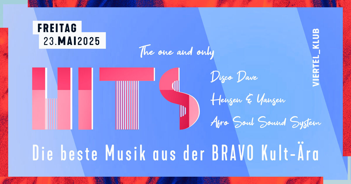 Auch im Wonnemonat Mai muss die Viertel Crowd natürlich nicht auf "Hits - the one and only!" verzichten. Die beliebte Partyserie gehört seit Eröffnung monatlich zum fixen Inventar des Viertel _Klub Programms... Und ganz nach dem Motto "never change a winning team", sorgt wie gehabt das gestandene Team rund um Disco Dave, Hensen & Yansen und dem Afro Soul Soundsystem für die passende Musik. Da trifft DJ Bobo auf die Spice Girls und Scooter gibt sich ein Stelldichein mit Eminem. Ausgelassene Hype-Stimmung garantiert!