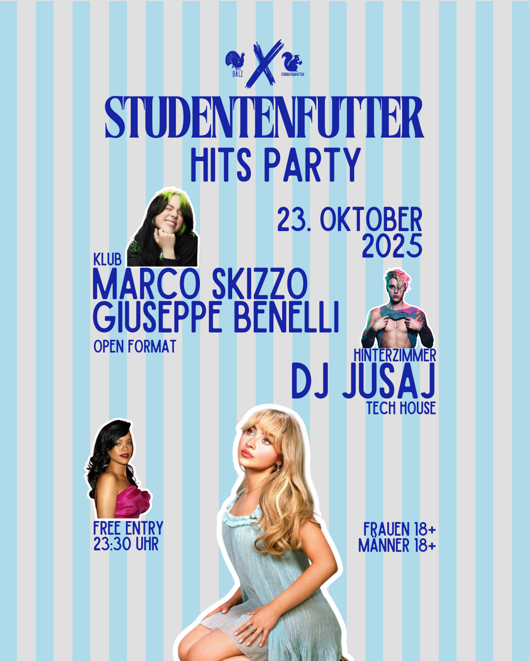 Bei der Studentenfutter Hits Party packen wir alles auf die Playlist, was ihr liebt – von zeitlosen Klassikern über 2000er-Guilty-Pleasures bis zu den aktuellen Chart-Bangern. Mitsingen, Mittanzen, Mitfeiern garantiert!