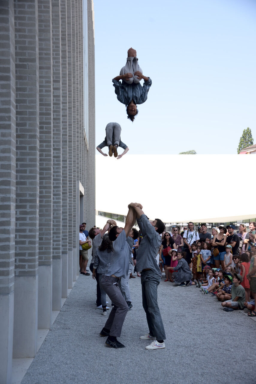 Der akrobatische Parcours «À l’échelle» vereint acht junge Zirkuskünstler:innen unterschiedlicher Zirkusdisziplinen und ist ohne Sprachkenntnisse für ein Publikum von ganz jung bis alt zugänglich. Die Compagnie Moost lädt das Publikum ein, ihr auf einem 40-minütigen Spaziergang zu folgen. Der akrobatische Parcours wird durch verschiedene Körperbilder und zirzensische Sequenzen rhythmisiert, die die Besonderheiten des Ortes mittels der Eigenheiten verschiedener Zirkusdisziplinen hervorheben.