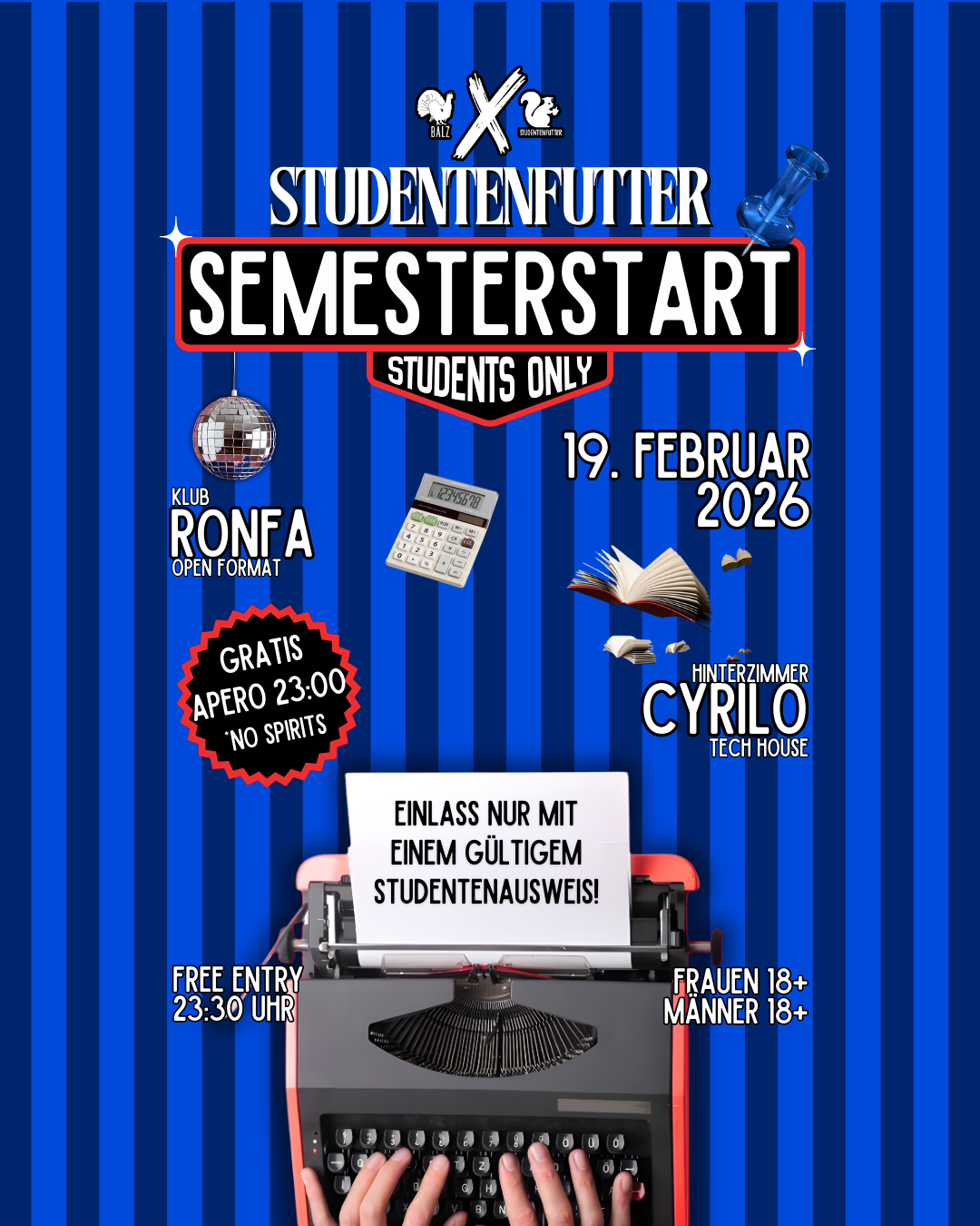 Der Eintritt ist ausschliesslich mit gültigem Studentenausweis möglich – für eine volle, junge Crowd und echte Campus-Vibes. Musikalisch erwartet die Gäste ein abwechslungsreiches Open Format im Klub Ronfa, während im Hinterzimmer Cyrilo mit treibendem Tech House für den passenden Late-Night-Sound sorgt.