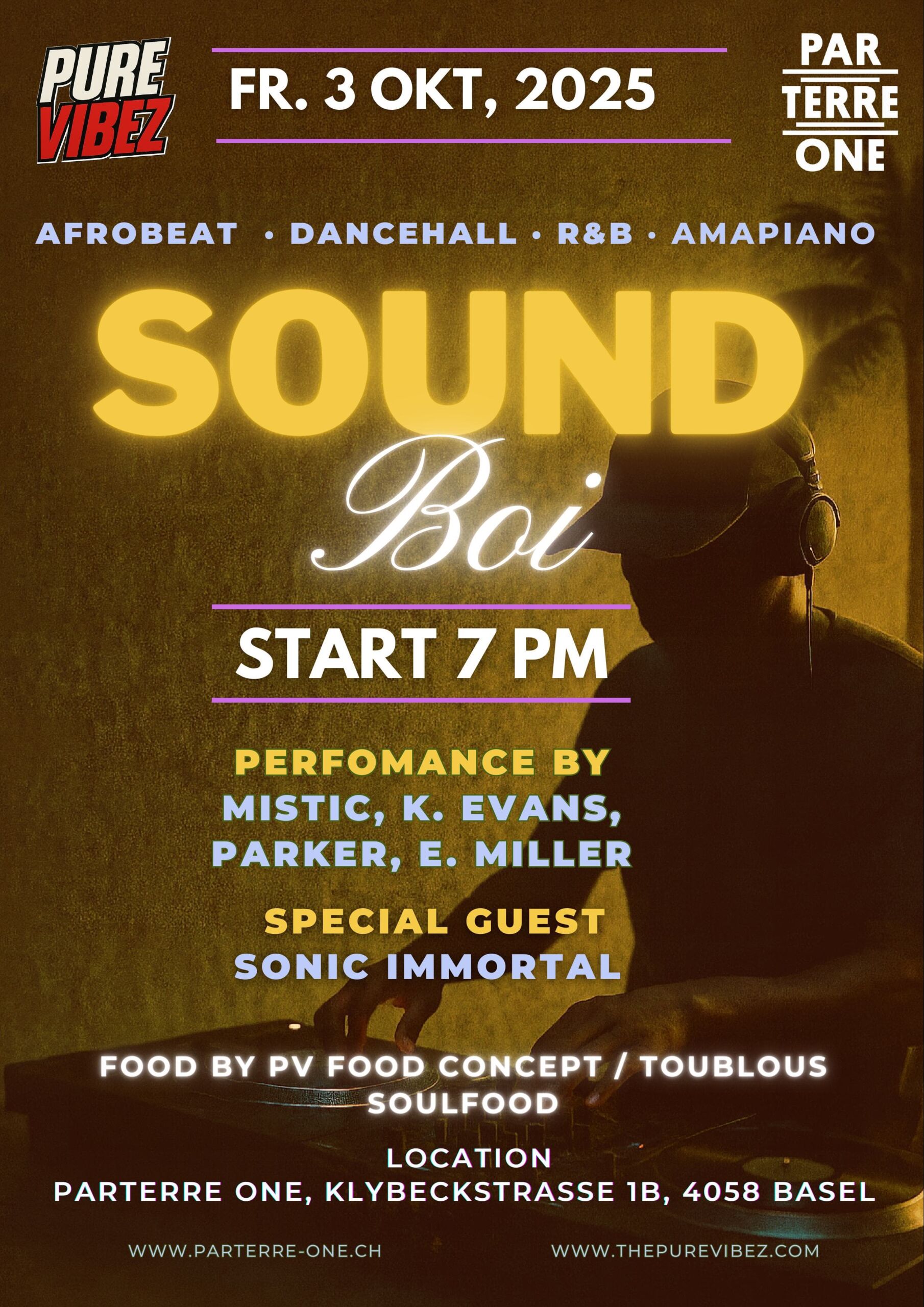 SOUND BOI ist das neueste Nightlife-Erlebnis von Pure Vibez, entwickelt, um Basel durch Rhythmus, Kultur und Gemeinschaft zu vereinen.