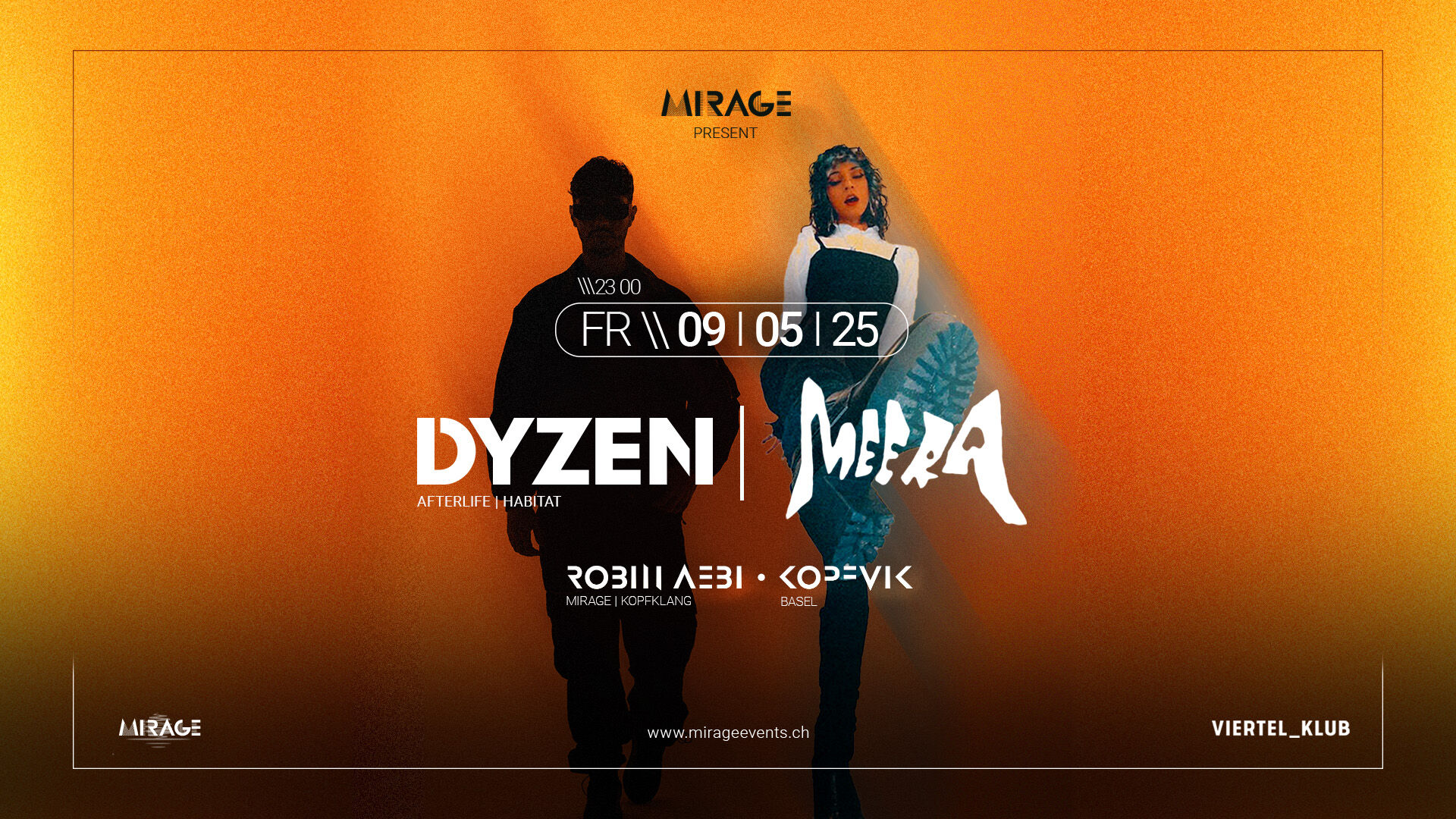 Auf zum vierten Akt von "Mirage" im Viertel _Klub! Das junge Basler Imprint hat sich für diese Ausgabe gleich zwei aufsehenerregende Gäste eingeladen. Zum einen ist da Francesco Perrone, besser bekannt unter seinem Pseudonym "Dyzen". Seit 2018 hat sich der Italiener aufgemacht zu einem der etabliertesten und solidesten Charaktere der internationalen elektronischen Musikszene zu werden. Zeugnis davon sind die Labels, auf welchen der Künstler releast: Afterlife, Odditi und Impressum, um nur ein paar zu nennen. Ihm zur Seite steht die Norwegerin "Meera". Schon in jungen Jahren begann ihre Liebe zur House Musik im Keller ihres Vaters und spätestens mit ihrer Debüt-Single "Music for Humans" im Jahr 2023 startet sie ihren unaufhaltsamen Weg ins kollektive Bewusstsein der Raverinnen und Raver rund um den Globus. Support kommt von den Local Heroes Kopfvik und Robin Aebi.