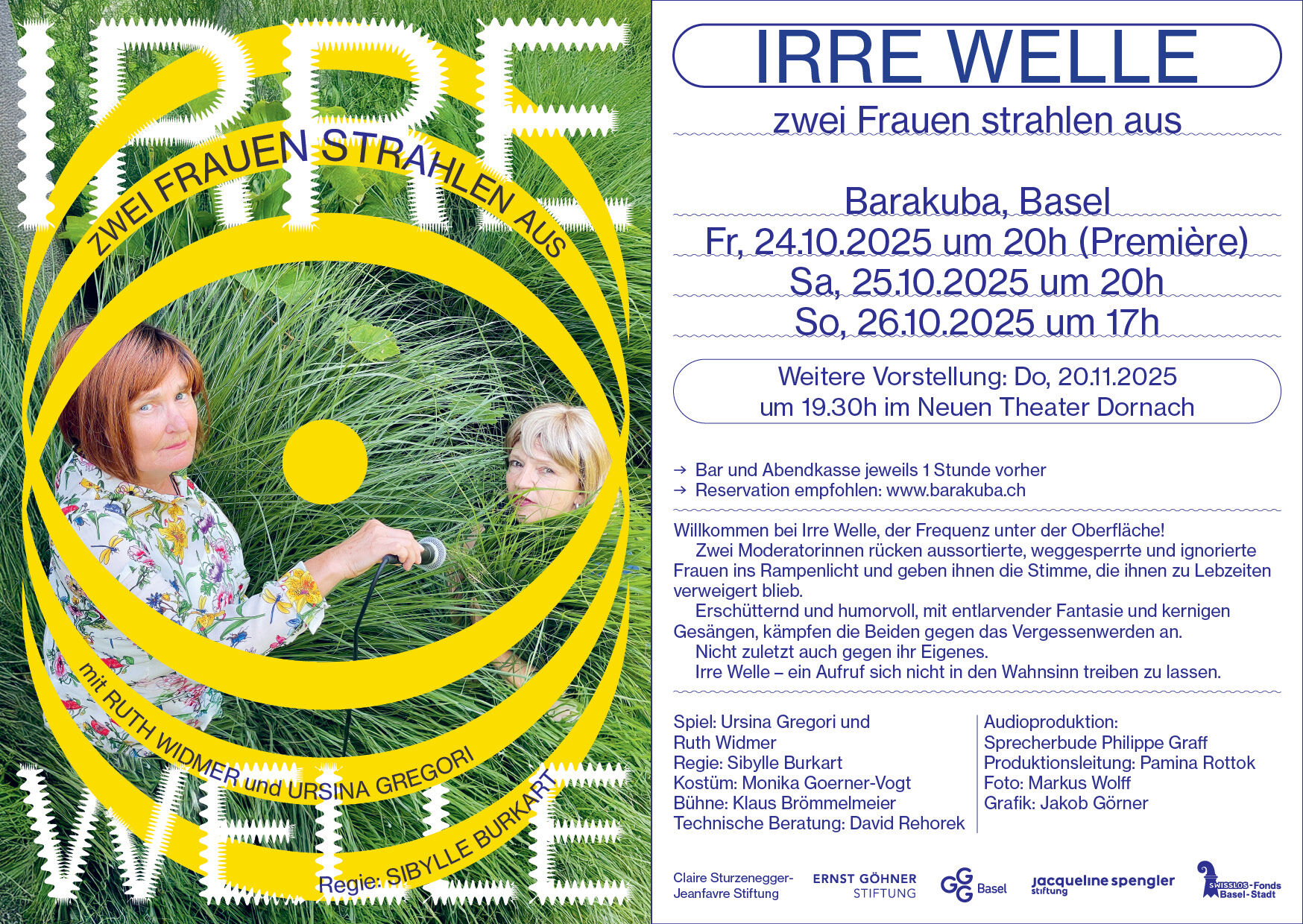 In der fiktiven Sendung «Irre Welle» senden zwei in die Jahre gekommene Moderatorinnen auf einer Frequenz unter der Oberfläche. Ihr Ziel: Frauen sichtbar machen, die aus dem gesellschaftlichen Blickfeld verschwunden sind – abgeschoben, ignoriert, vergessen. Diese Sendung verleiht ihnen Stimme, Bühne, Erinnerung. Mal tragisch, mal scharfzüngig, mal musikalisch.