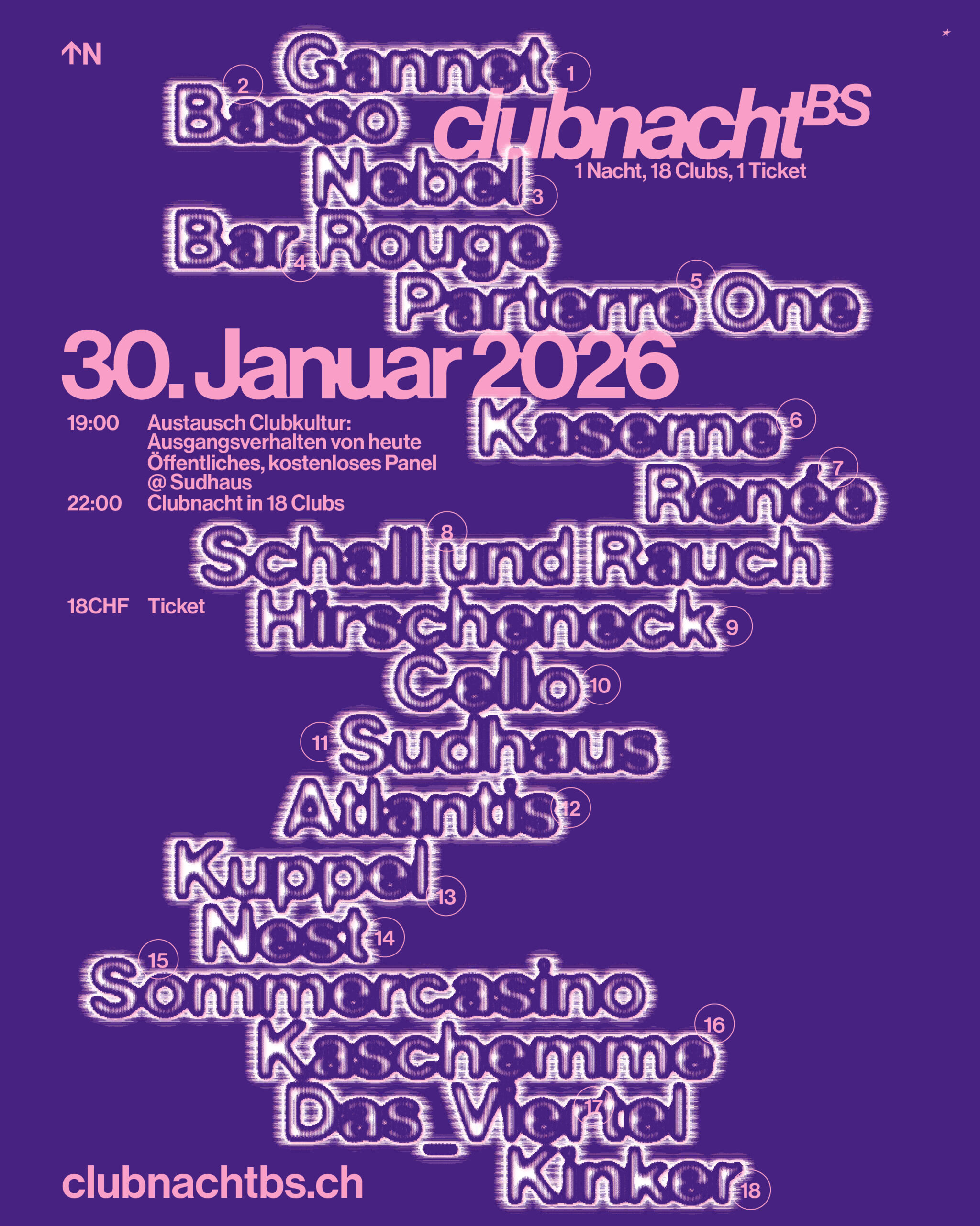 Die Nacht vom 30. Januar 2026 gehört achtzehn Basler Clubs! Mit ihrem Programm zeigen sie die Vielfalt des lebendigen Nachtkultur-Angebots der Stadt im Dreiländereck. Doch nicht nur das: am frühen Abend findet ein öffentlicher, internationaler und kostenloser Austausch zur Zukunft der Clubkultur statt. Welche Rahmenbedingungen braucht es für eine attraktive Nachtkultur?