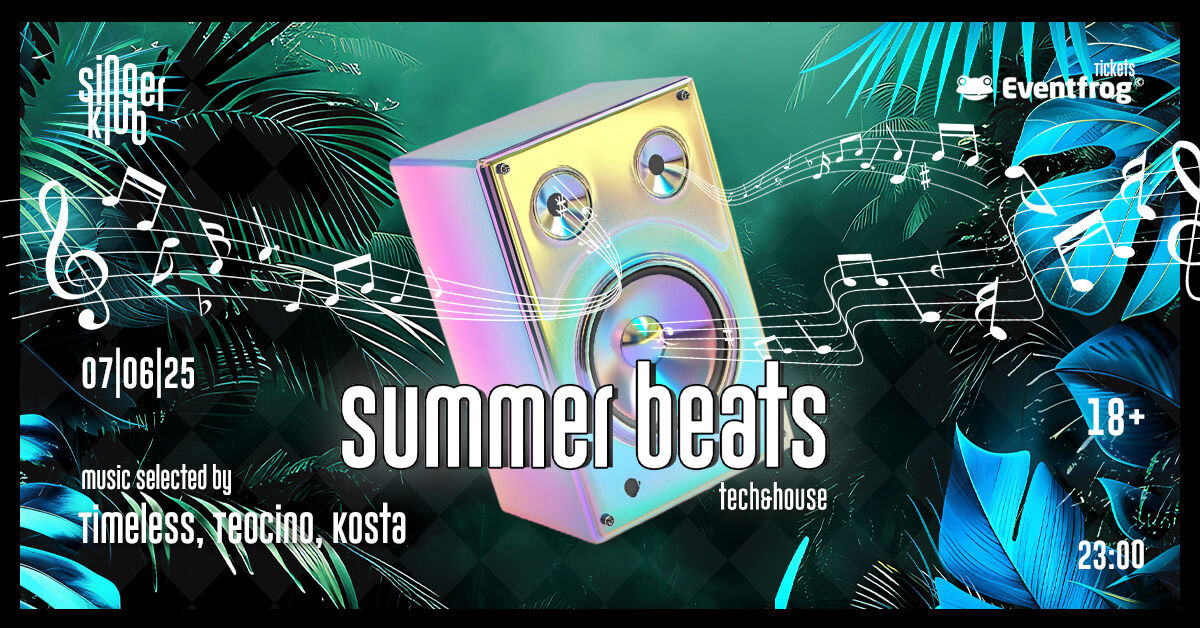 summer beats bringt elektronischen sound und flair in den singerklub. die ganze nacht lang liefern wir house, techhouse und techno. an den decks stehen mit dreifach power kosta, timeless und teocino, die deine nacht mit unverwechselbaren beats veredeln. lass dich von satten basslines mitreißen und feiere bis in die frühen morgenstunden!