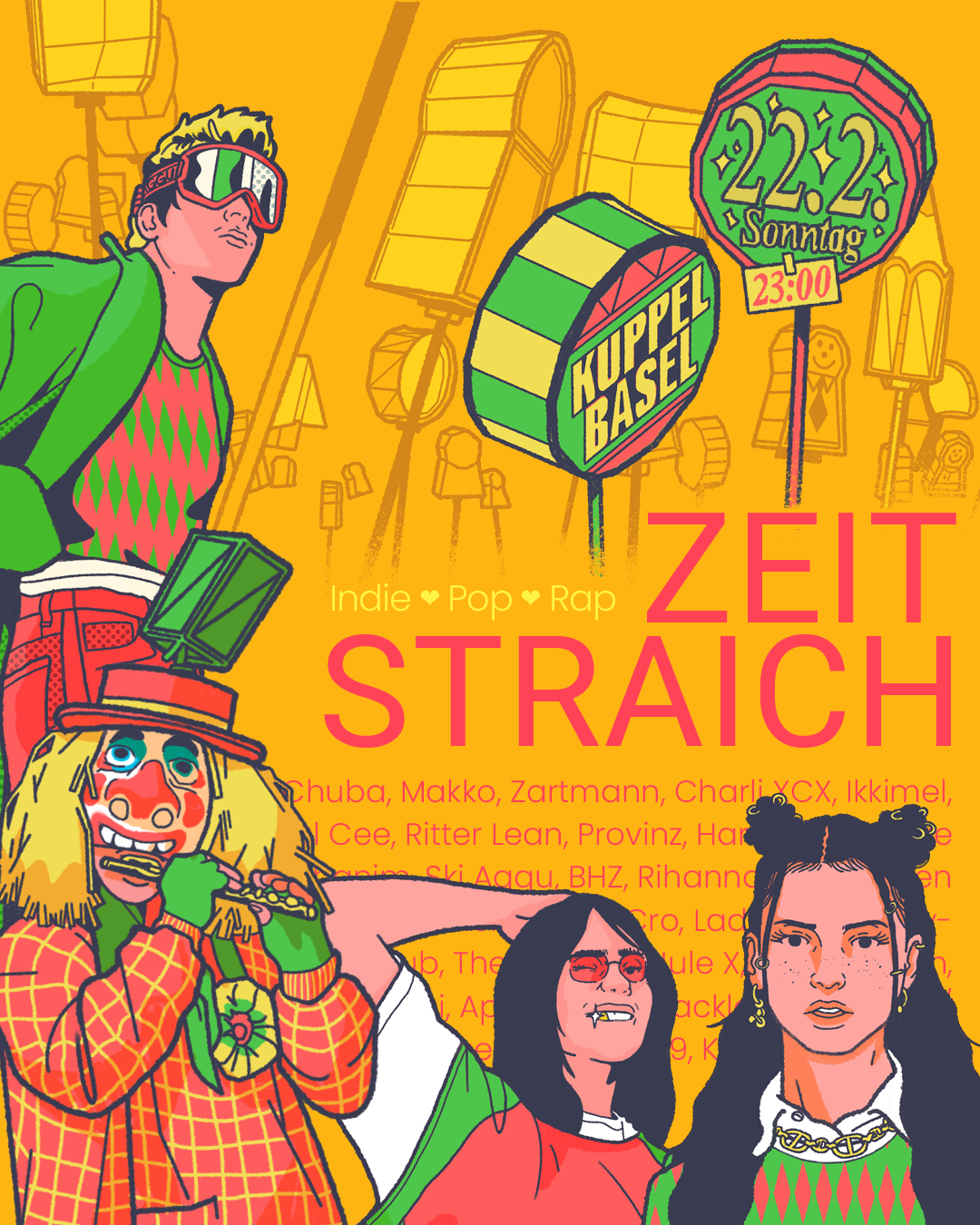 An der Zeitgeist Party tanzt du zu den aktuellsten Hits der Welt. Auch vor dem Morgestraich. Egal ob Pop von Billie Eilish, Dance Hits von Ski Aggu, Rap von Apache207 oder Indie Banger von Giant Rooks. Wir haben die Tracks aus deiner Playlist und du bringst deine besten Dance Moves zu uns in den Club. Deal?