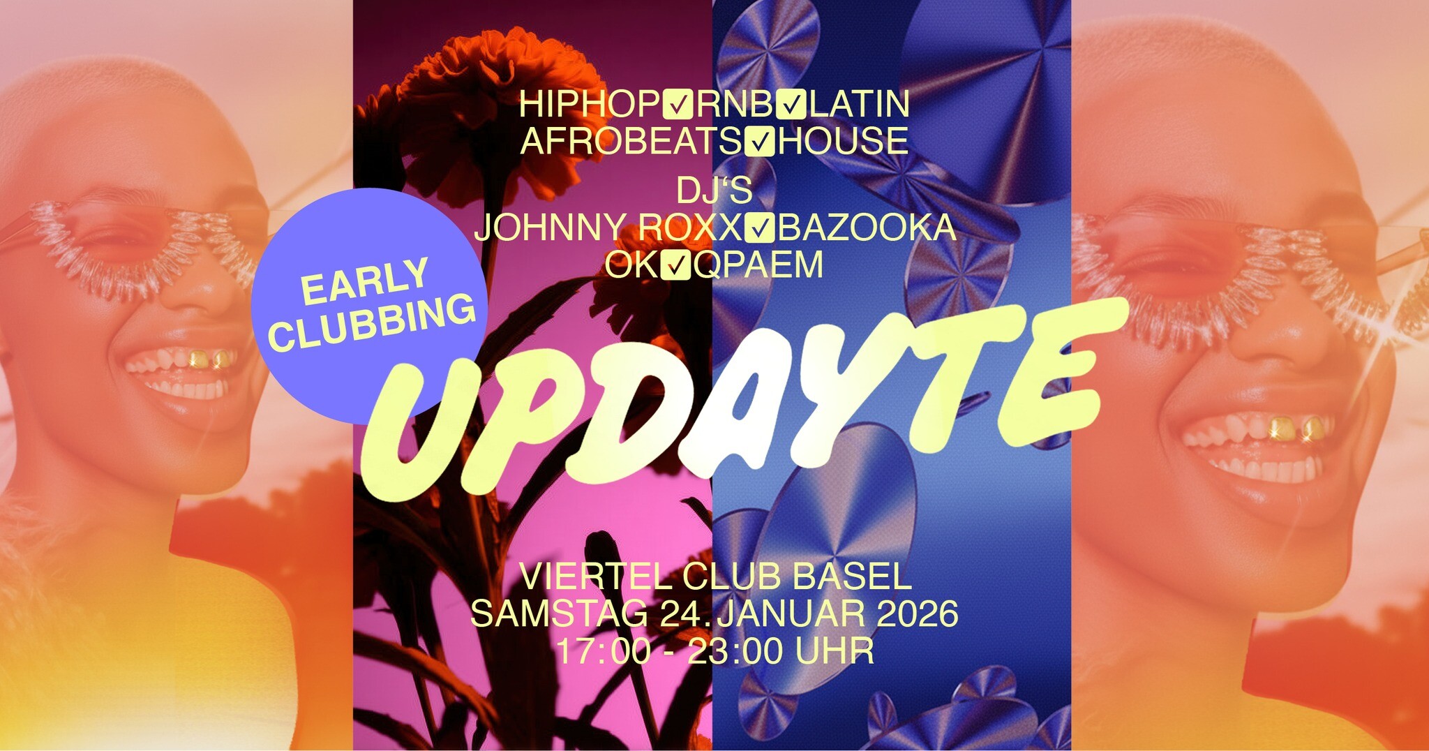 Mit UPDAYTE liefern wir euch ein echtes Day-into-Night Erlebnis im Viertel Klub. Wir starten um 17:00 Uhr und liefern bis 23:00 Uhr das beste aus Hip Hop, Afrobeats, Latin & House - basically ein musikalisches "ich hol dich da ab, wo du bist".