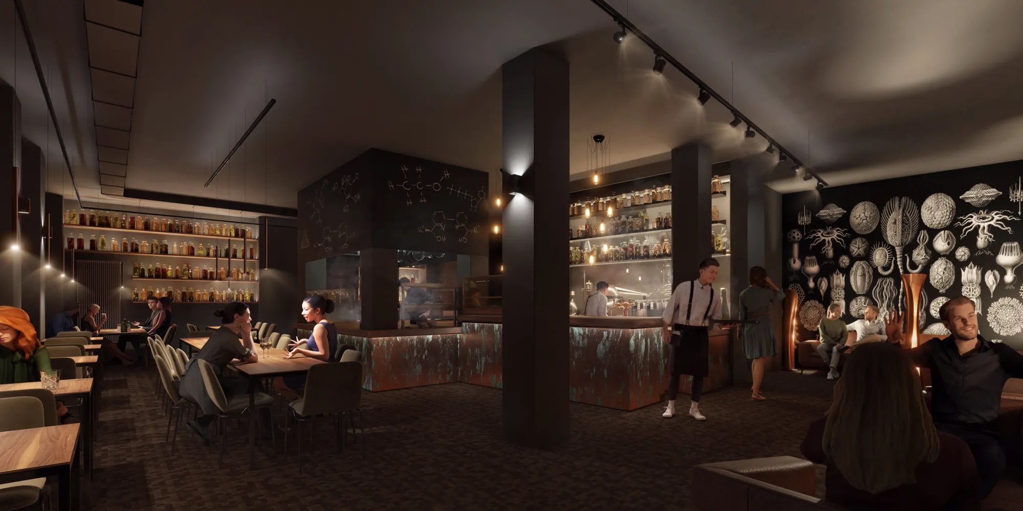 Gäste geniessen tagsüber frische Säfte, Sirups, hochwertige Tees und Kaffee. Mittags trifft man sich auf einen Casual Lunch, ein täglich wechselndes Menü mit vier Speisen plus Salat. Abends gibt es Snacks an der Bar, Drinks in der Lounge und überraschende Sharing-Dishes im Restaurant. Die Karte bietet geschmacksintensive, authentische Gerichte aus aller Welt. Soulfood im besten Sinne, serviert in kleinen Schalen und Cocottes zum Teilen. Mit einem aromatischen Twist und frischen Kräutern bilden sie eine spannende Fusion Tavolata. Einige Gerichte können mit einem individuellen Finish selbst abgeschmeckt werden. Alles wird frisch aus hochwertigen Zutaten zubereitet. Ein besonderer Fokus liegt auf würzigen Schmorgerichten und pflanzenbasierten Kreationen. Das Getränke-Pairing ist perfekt auf die Speisen und den Mood der Gäste abgestimmt. Die hausgemachten Säfte, Sirups, Infusionen und Drinks werden in Erlenmeyern, Rundkolben und anderen Laborgläsern serviert.