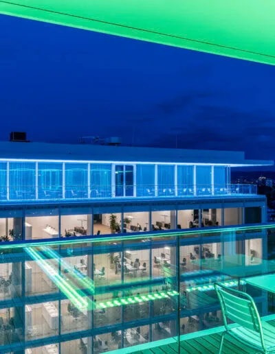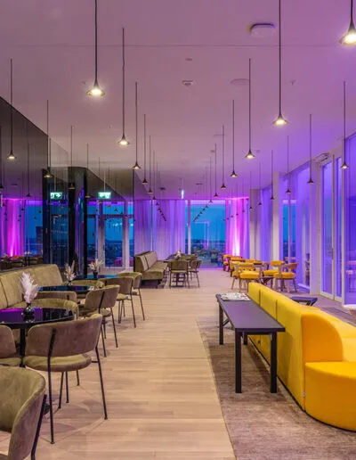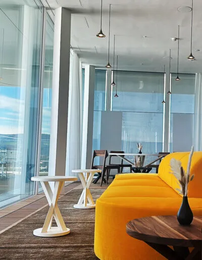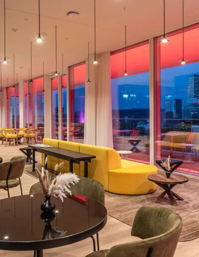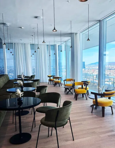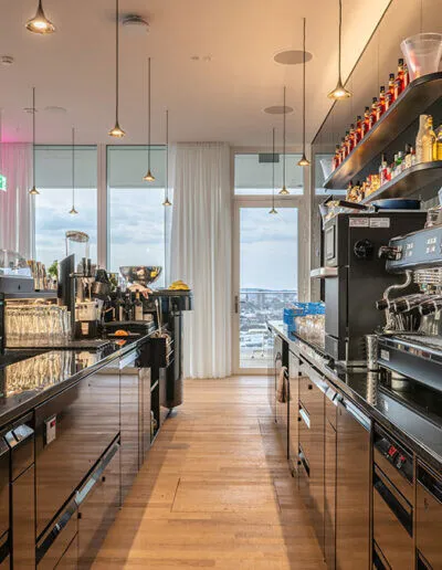 Das B1 Rooftop Bistro bietet ein beeindruckendes 360° Panorama und eine einladende Terrasse, die den ganzen Tag über kleine Köstlichkeiten serviert. Das Raum- und Einrichtungsdesign, entwickelt vom international renommierten Architekturbüro Herzog & de Meuron, vereint grossstädtisches Flair mit traditioneller Gemütlichkeit. Besonders abends entfaltet das Lichtkonzept des weltbekannten Künstlers James Turrell eine einzigartige Magie, die sowohl den Innen- als auch den Aussenbereich in ein besonderes Licht taucht. Das Bistro ist ein Ort der Begegnung und des Genusses, der sowohl für entspannte Stunden als auch für gesellige Abende einlädt.