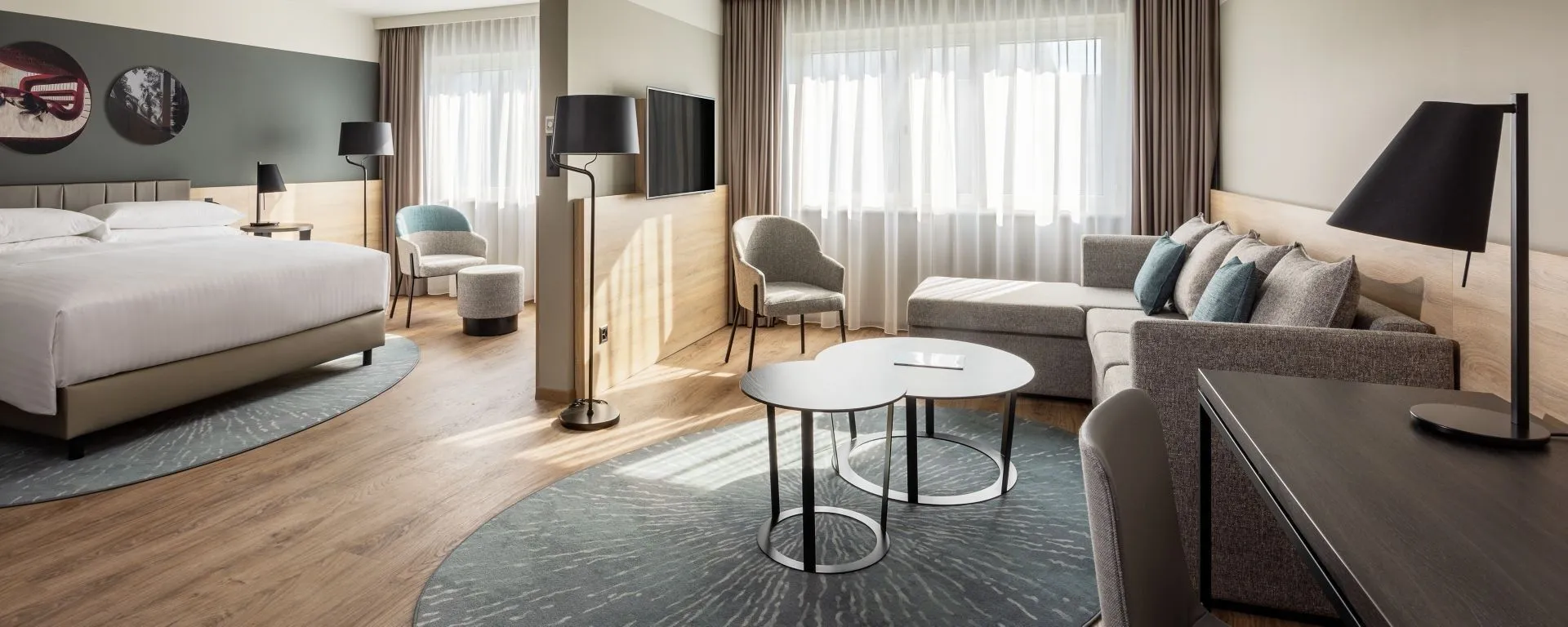 Das frisch renovierte Basel Marriott Hotel ist im Herzen Europas angesiedelt und dient zukunftsorientierten Reisenden als dynamische Basis in einer der kulturell reizvollsten Städte der Schweiz. Das Hotel beeindruckt sowohl Geschäfts- als auch Urlaubsreisende mit einer perfekten Lage und optimaler Anbindung an die Messe und das Congress Center Basel. Die historische Altstadt fussläufig erreichbar. Durch die Nähe zum Rhein, zum internationalen Flughafen Basel und zu den wichtigsten Autobahnen der Region ist das Hotel für Reisende auf dem Luft-, Land- oder Wasserweg bestens erreichbar. Die 218 Zimmer und 21 Suiten des Basel Marriott Hotels sind so konzipiert, dass sie jedem Lifestyle gerecht werden. Durch ihr intelligentes, ergonomisches Design repräsentieren sie eine zeitgemässe Wohnkultur. Als Vorreiter eines neuen Gastronomiekonzepts serviert das HERITAGE Basel innovative Gerichte, die zum Teilen einladen, und bereichert die Stadt mit modernen Köstlichkeiten. Unsere neun lichtdurchfluteten und mit Hightech ausgestatteten Meetingräume eignen sich hervorragend für alle, die Basel beruflich besuchen. Und wenn Sie entspannen möchten, versprechen das grosse Fitnessstudio und das Spa mit Sauna den perfekten Ausgleich nach einem anstrengenden Tag.