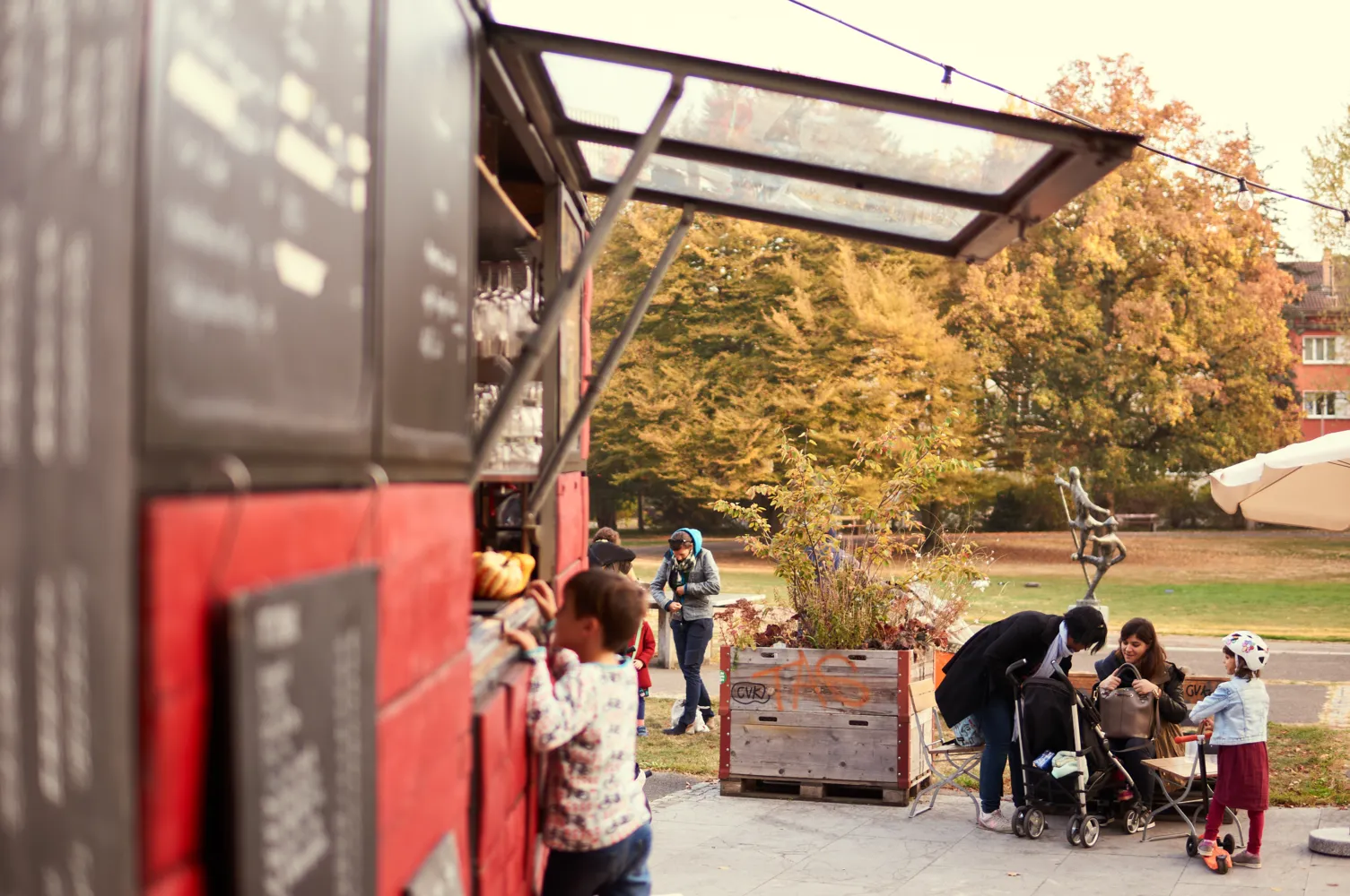 Von Dienstag bis Sonntag kann man bei guter Witterung im Christoph Merian-Park verweilen, die Mittagspause verbringen, den Nachmittagskaffee trinken oder den Feierabend geniessen.