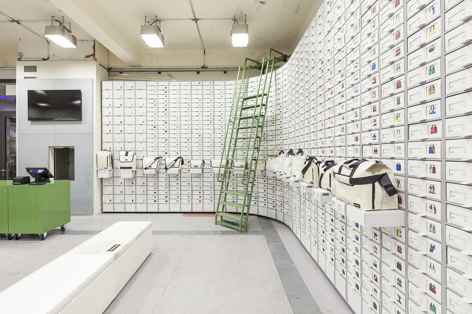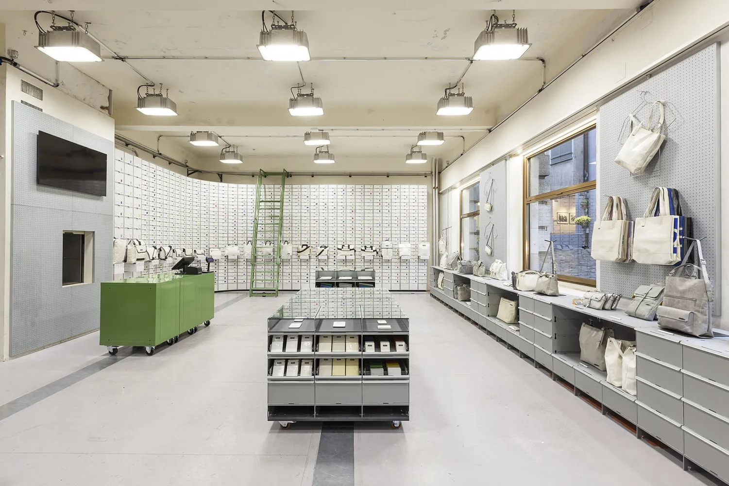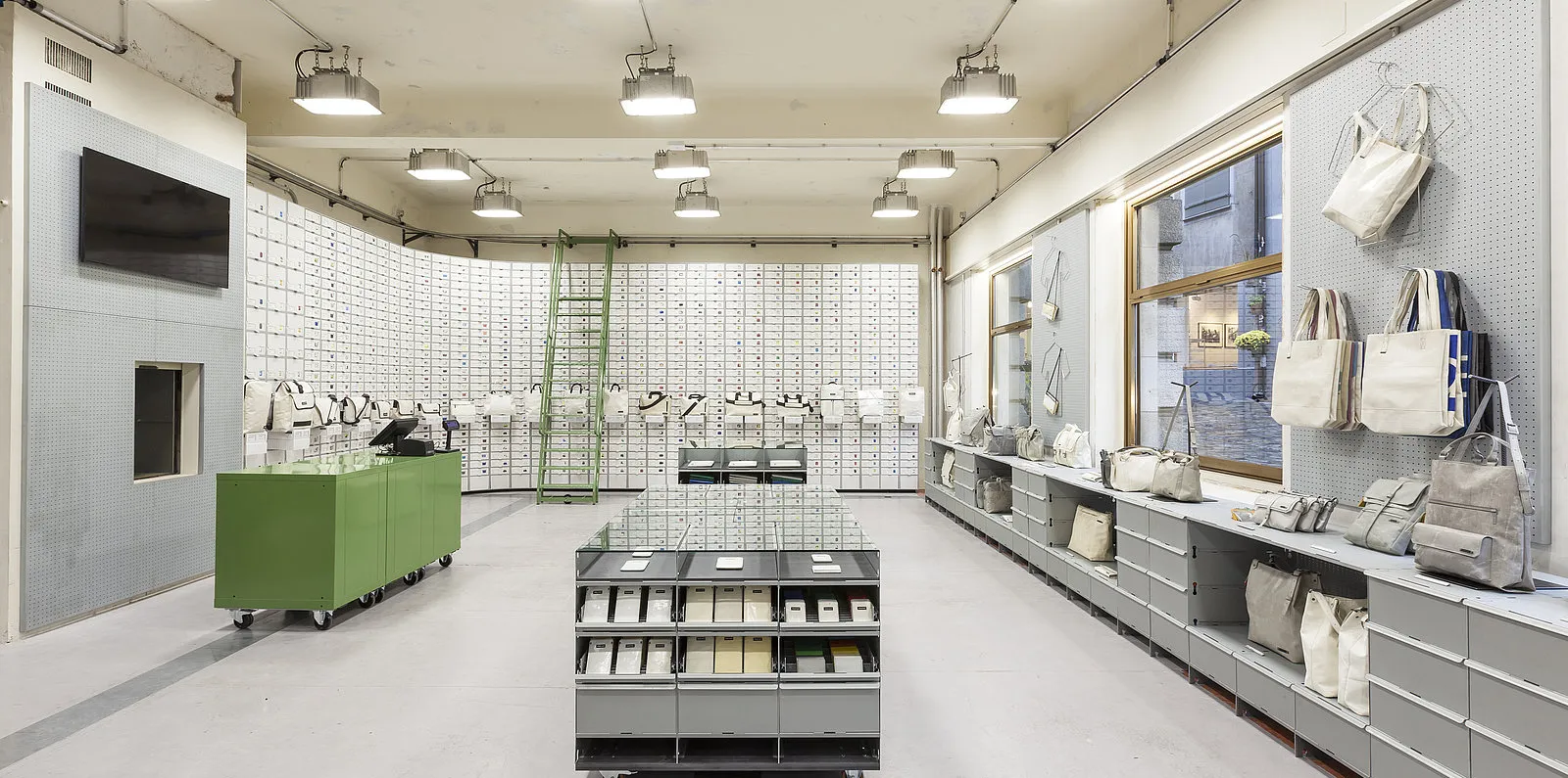 Im November 2016 eröffnete FREITAG in Basel den 12. eigenen Store. Zum ersten Mal führt die Zürcher Taschenmanufaktur dabei kein Einzelmieterdasein wie in den bisherigen Stores von Tokyo bis Lausanne und haust auch nicht in einem flugrostigen Containerturm wie im Flagship Store in Zürich. FREITAG geht in Basel unter die Leute und freut sich sehr, mitten im Kaffeehaus Mitte einzuziehen. Schliesslich ist die erste FREITAG Tasche vor mehr als 20 Jahren auch nicht in einer einsamen Einzimmerwohnung, sondern in einer WG entstanden. Auch das Store-Konzept, das in Zusammenarbeit mit spillmann echsle architekten entwickelt wurde, nimmt den Community- und Collaboration-Gedanken auf. Mit Schreib- und Arbeitsplätzen aus der Fabrik in Zürich-Oerlikon, die frei zur Verfügung stehen, wird die Grenze zwischen Store und Kaffeehaus durchlässig und die Tradition der «Mitte» fortgesetzt, auch Besucher und Besucherinnen, die nichts konsumieren, willkommen zu heissen. Mit dem 85m2 grossen, neuen Store wird das FREITAG Angebot in Basel zusätzlich zu jenem der langjährigen Verkaufspartner um 1500 Taschenunikate erhöht. Dabei zollt die Inneneinrichtung der nebensächlichen Tatsache Respekt, dass das höchste Gebäude der Schweiz heute in Basel steht: Das Designpreis-gekrönte, modulare FREITAG Taschenregalsystem namens V30 wurde noch nirgends zuvor so hoch gestapelt.