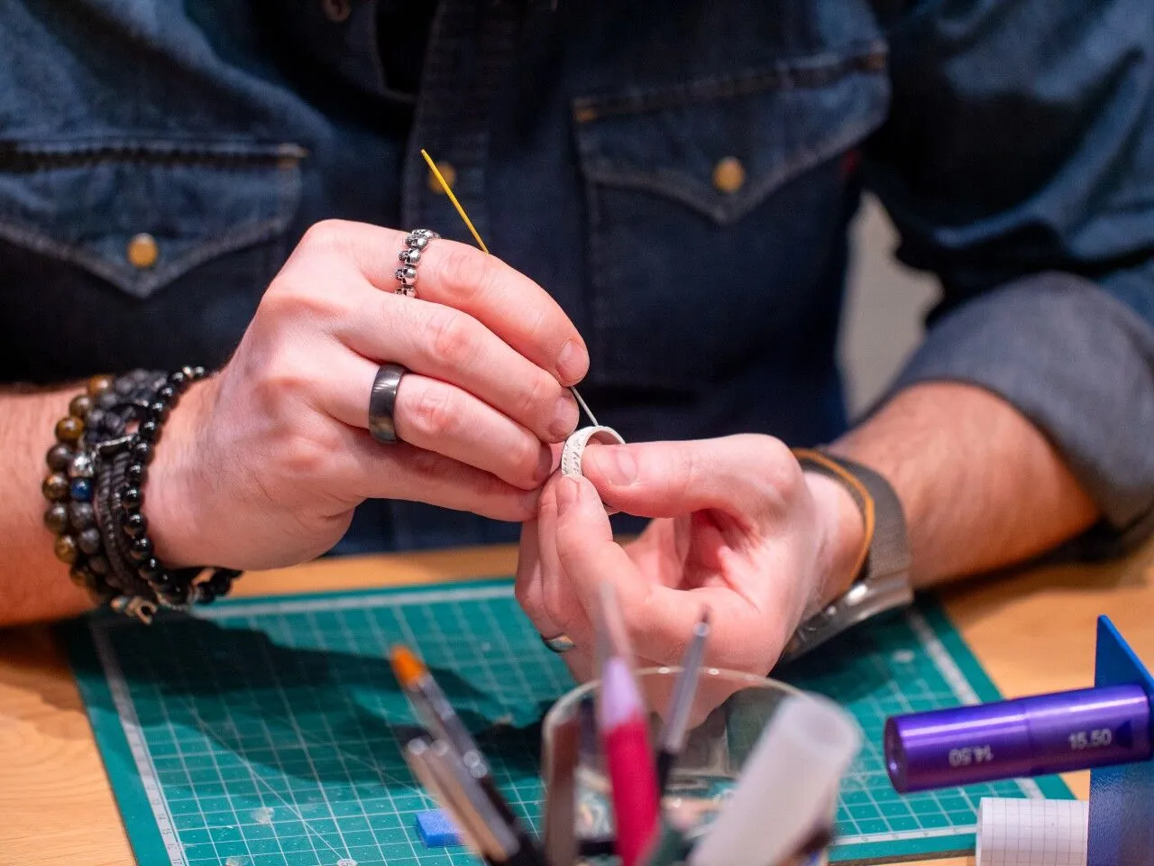 In unseren Workshops und Teamevents formst du aus weichem Silberton dein eigenes Schmuckstück aus echtem Silber. Schritt für Schritt erlebst du, wie aus einer einfachen Idee ein glänzendes Unikat wird – ein Moment, der immer wieder Staunen auslöst.