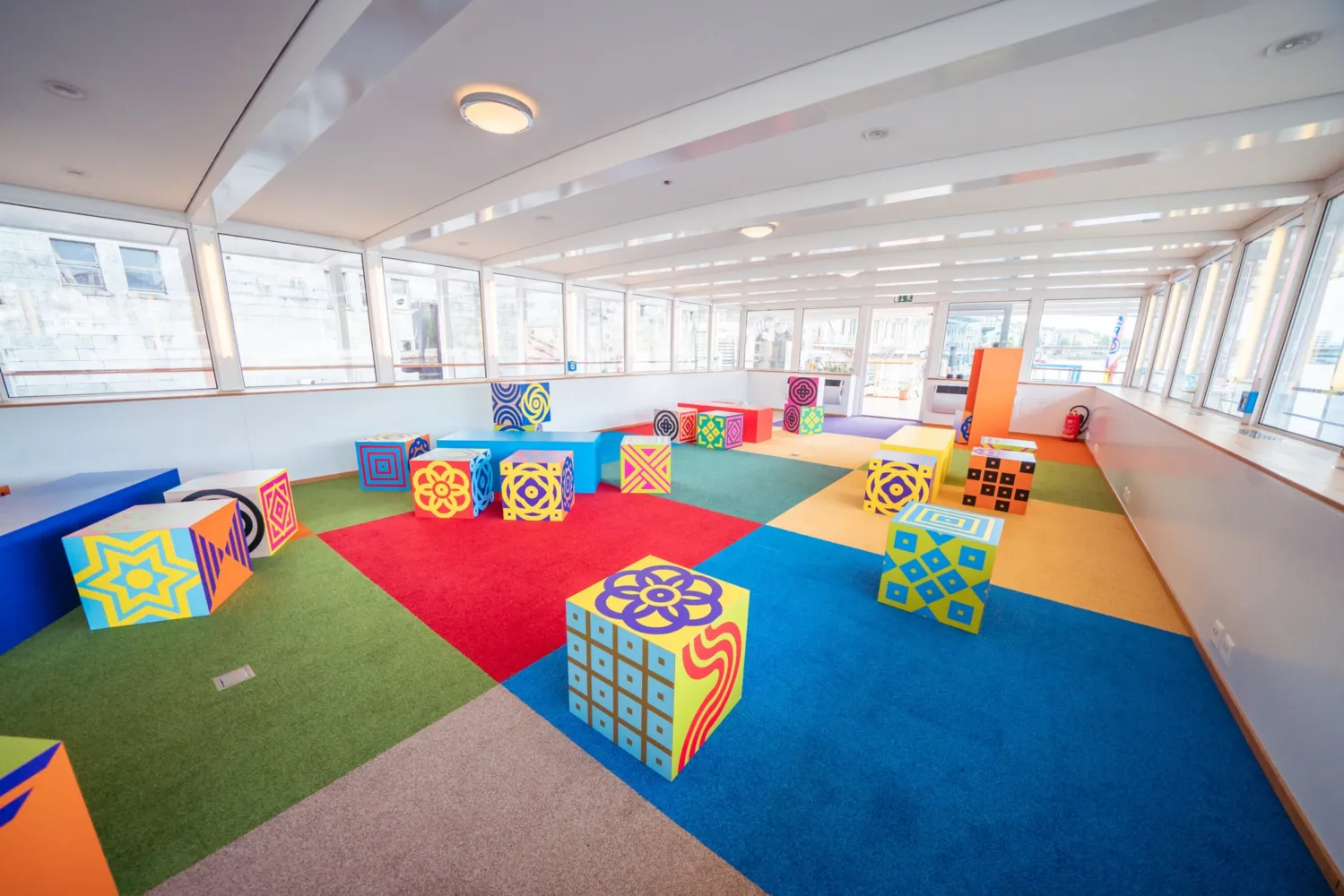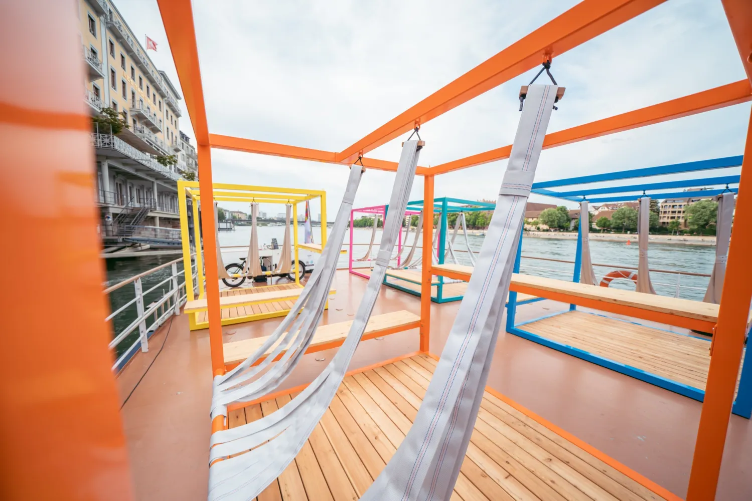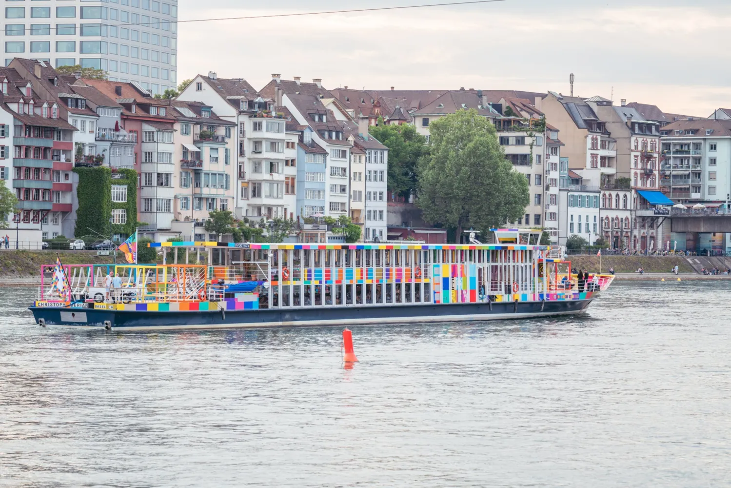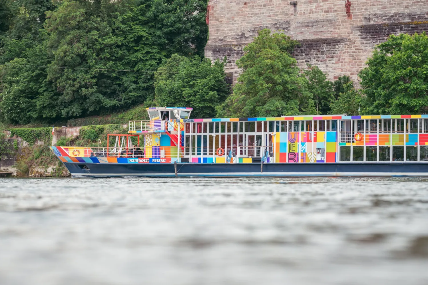 Der bunte Look des einstmals sachlich eleganten Schiffs mit Baujahr 1992 sorgt auf beiden Seiten des Rheins für aufgeregtes Fotografieren, denn tatsächlich ist das Umstyling der MS Christoph Merian etwas verrückt: Das Schiff der Basler Personenschifffahrt wurde komplett mit Folien beklebt, was nicht nur von aussen für lachende Gesichter und Staunen sorgt, sondern vor allem von innen, von wo aus die Stadtkulisse in allen möglichen Flâneur-Farben an einem vorbeizieht.