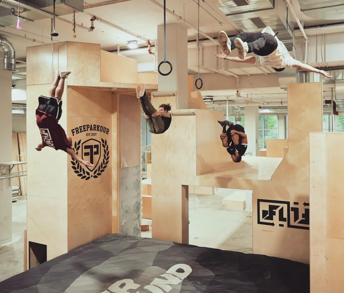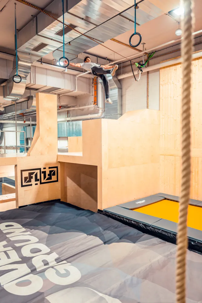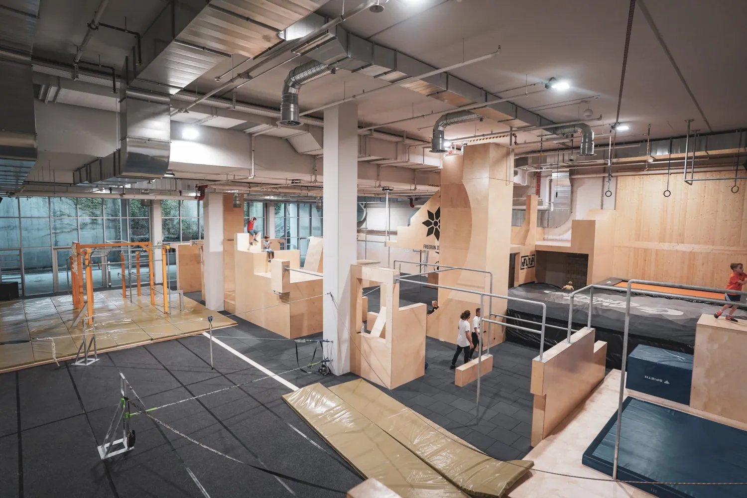 Mehr als 2’500m2 voller Trainingsmöglichen für Ninja Warrior, Parkour, Chase Tag, Trampolin und Slackline.