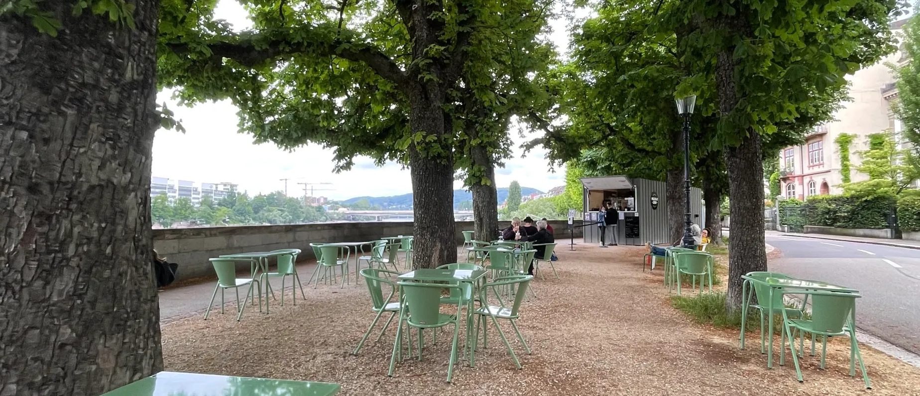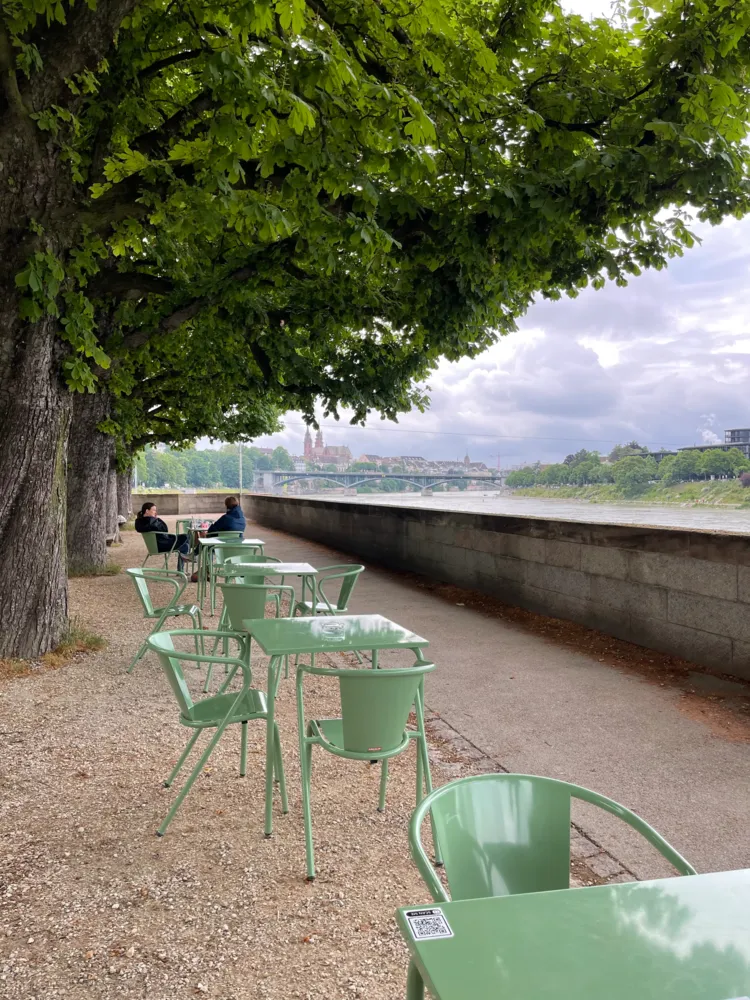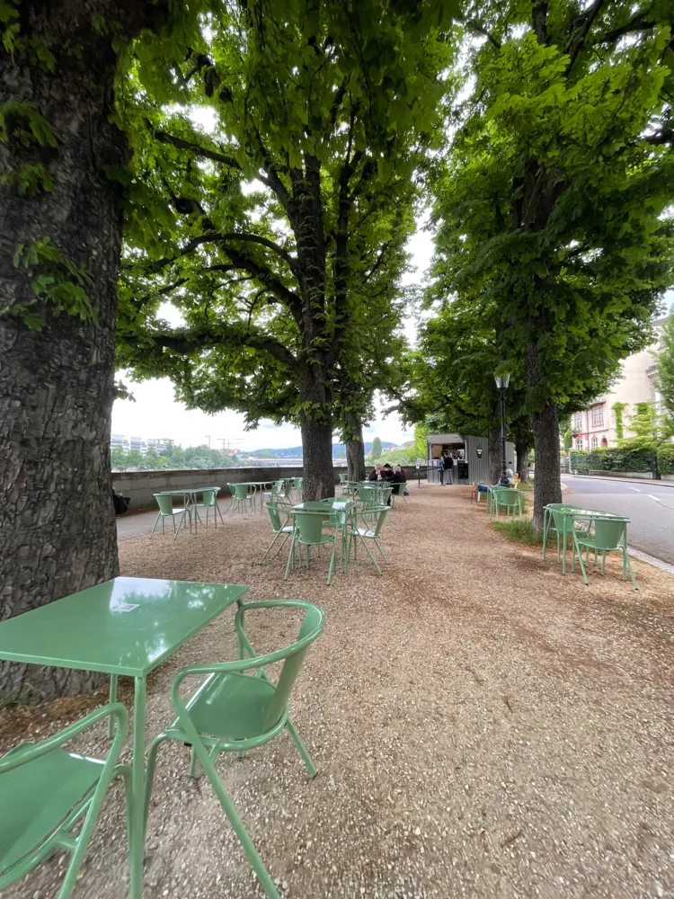 Die Buvette liegt am St. Alban-Rheinweg, unter den Kastanienbäumen zwischen dem Rhein und den Stadtmauern.