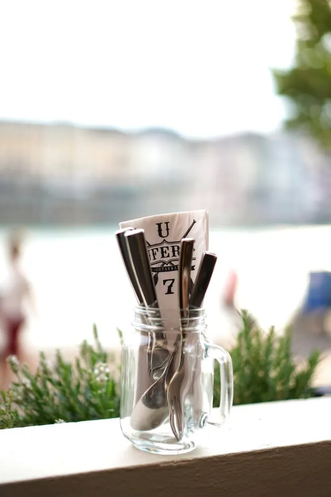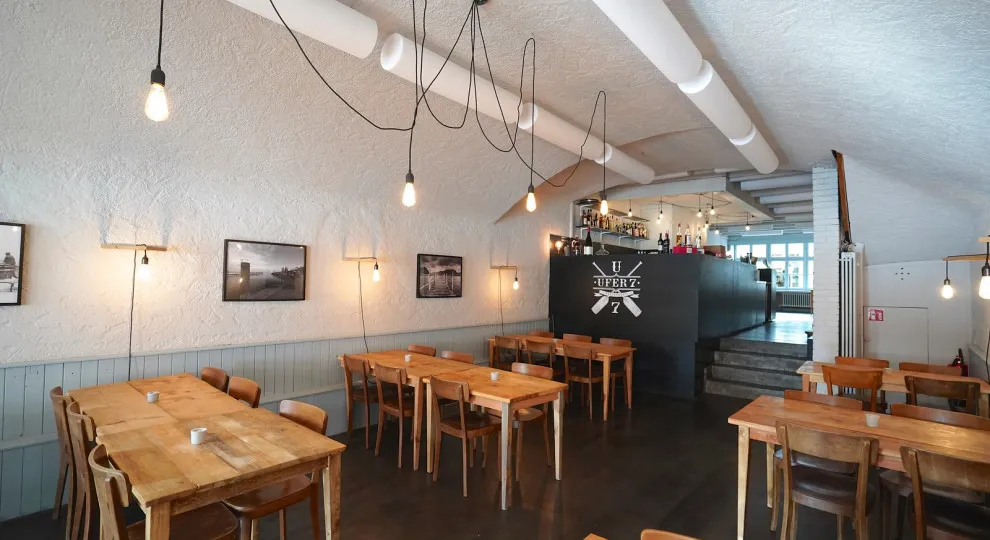 Das Ufer7 ist ein unkomplizierter Treffpunkt direkt am Rhein, mit viel Retrostil, nostalgisch und trotzdem modern und erfrischend. Es dominieren Holz- und vertraute Farbtöne. Die Möbel sowie das gesamte Interieur präsentieren sich in schlichter, gradliniger, einladender und zeitloser Eleganz. Die Einrichtung ist somit am treffendsten mit «trendig, urbanes Design und Retro-Charme» zu umschreiben und besteht aus Vintage-Elementen, handverlesen und zusammengestellt mit verschiedenen Partnern.