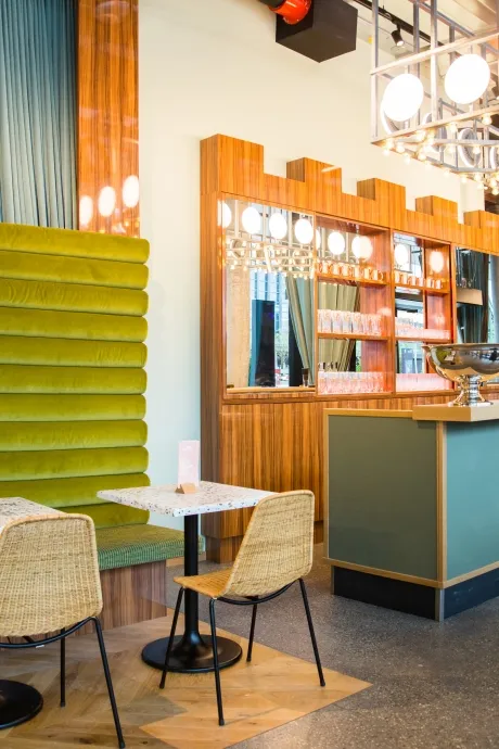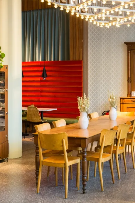 Wir haben uns durch Meret Oppenheims Kunst inspirieren lassen und mit verspielten, skurrilen Materialien einen theatralischen Raum geschaffen, der sich im Verlauf vom Tag zur Nacht verändert. So verwandeln wir das tibits Gundeli am Abend zu einer Bar, wo Bier, Wein, Drinks und leckere Cocktails geschlürft werden können. Dabei bilden die hohen Räume, übergrossen Sitzbänke und Sitznischen auf unterschiedlichen Ebenen das perfekte Ambiente, um das schmackhafte tibits Essen und die Gesellschaft toll geniessen zu können.