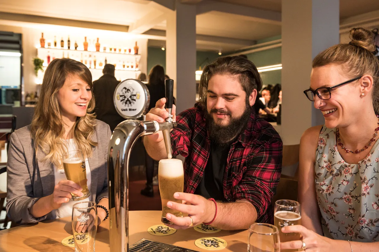 Machst Du auch beim Essen keine Kompromisse? Dann bist Du bei uns in der weltoffenen Rheingasse im Herzen des Kleinbasels bestens aufgehoben. In der Ueli-Brau-Bar lebt die lokale und mutige Brautradition auf. Den umgebauten Gastraum schmücken Elemente aus der 1974 im Nebenhaus gegründeten Brauerei Fischerstube. Dank unserem Herzstück, eine 100 Liter-Brauanlage, brauen wir regelmässig exklusive Biere in kleinen Mengen. Diese landen frischgezapft bei Dir auf dem Tisch.