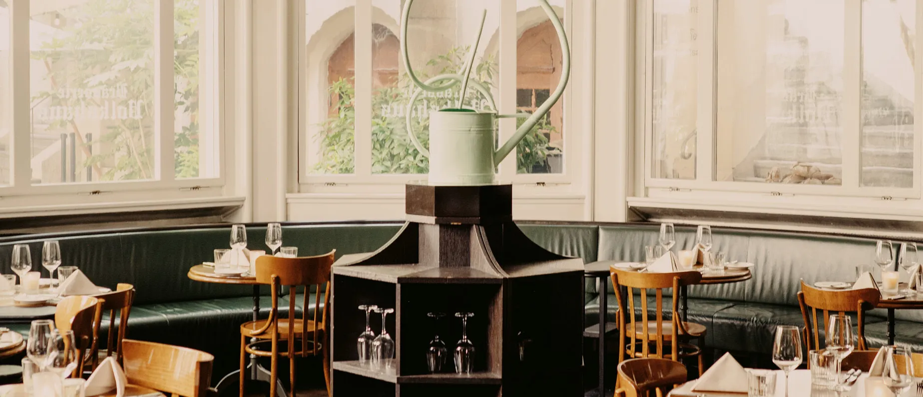 Der von den renommierten Architekten Herzog & de Meuron gestaltete Innenraum vermittelt Grossstadt-Atmosphäre und lässt gleichzeitig Gemütlichkeit nicht vermissen. Unter dem Lichtermeer mundgeblasener Leuchten, mit Blick in den baumbewachsenen Innenhof und auf die Werke bedeutender zeitgenössischer Künstler lässt sich der Alltag vergessen und schöne Momente erleben.