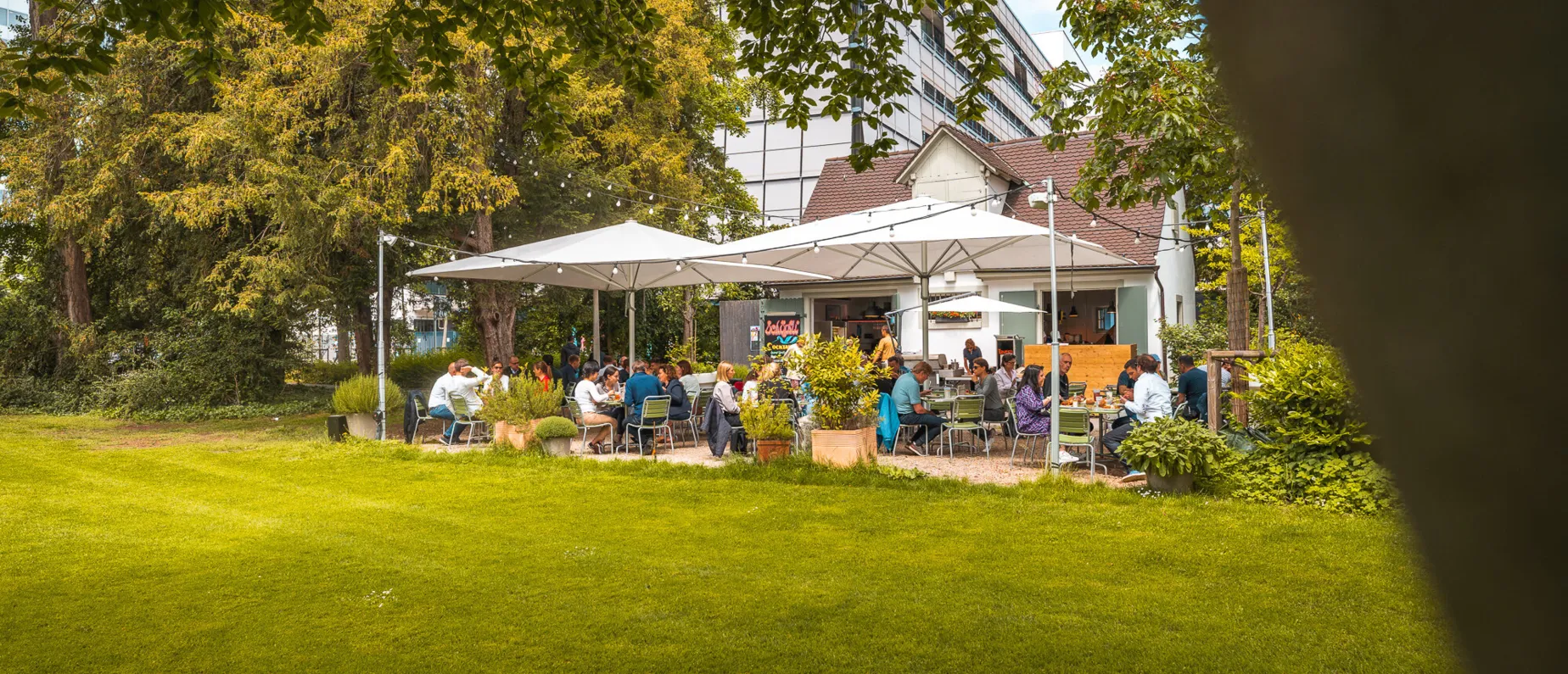 Am Tisch unter dem Sonnenschirm, hängend im Liegestuhl oder liegend auf der grünen Wiese lässt es sich gut gehen. Mit dem Museum Tinguely, den imposanten Roche-Türmen und dem Rhein in nächster Nähe bildet das Schöpfli im Park eine kleine, charmante Oase der Erholung inmitten dieser inspirierenden, urbanen Umgebung.