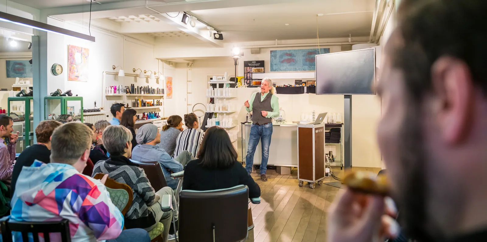 Ums Hören ging es tatsächlich bei seiner Präsentation. Peter Philippe Weiss hielt die Gäste an, sich mit geschlossenen Augen einem Klangerlebnis hinzugeben. Das Interessante daran: Alle hören dasselbe – doch sehen wir mit unserem inneren Auge Unterschiedliches. Das macht den Klang immer auch zu einem ganz individuellen Erlebnis, welches sich aus der Erfahrung und der Fantasie des Einzelnen zusammensetzt. Peter Philippe Weiss hat mit Musik und Klang viele Jahre experimentiert und gearbeitet, ist mit Projekten gescheitert und hat manchmal den Mut verloren bis ihn die Neugier wieder gepackt hat und ihn an ganz neue, spannende Projekte heranführte. Sein Fazit: Manche Dinge im Leben brauchen Geduld und Zeit bis sie gut werden. Deshalb lohnt es sich, mit Neugierde «dran zu bleiben».