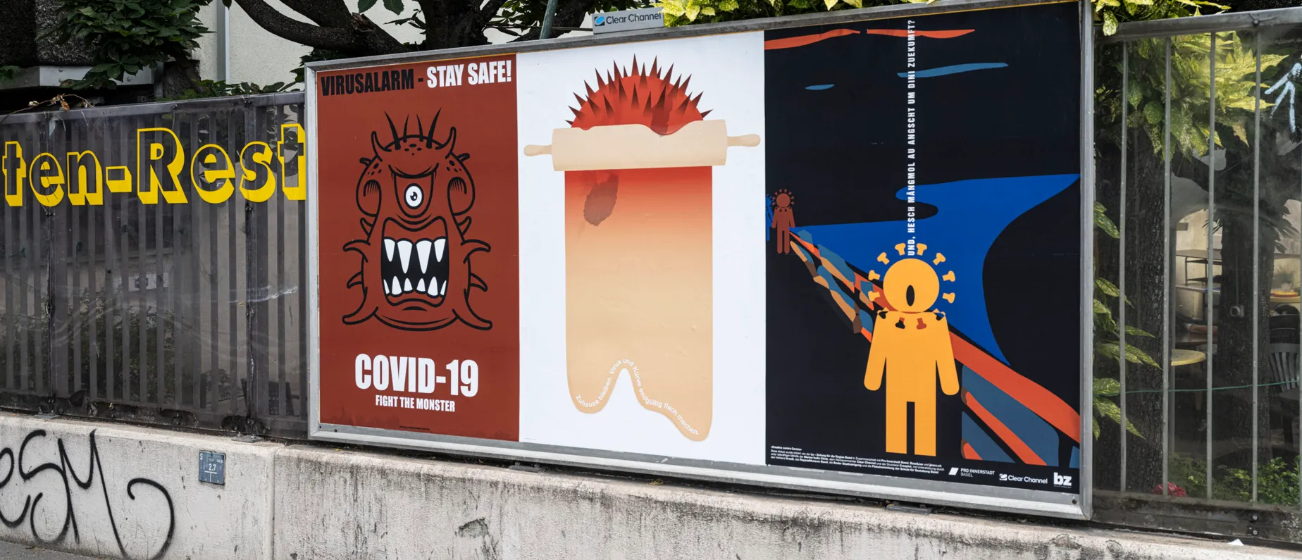 Die vergangenen Monate waren vor allem von zahlreichen Regeln, Massnahmen und Gesetzen geprägt. Doch all diese Schutzkonzepte und einschränkenden Verhaltensrichtlinien müssen nicht zwingend mit erhobenem Zeigefinger daher kommen. Dass es auch anders geht, zeigt die grosse Plakataktion «Kreative contra Corona», die es momentan in der ganzen Stadt zu entdecken gibt.