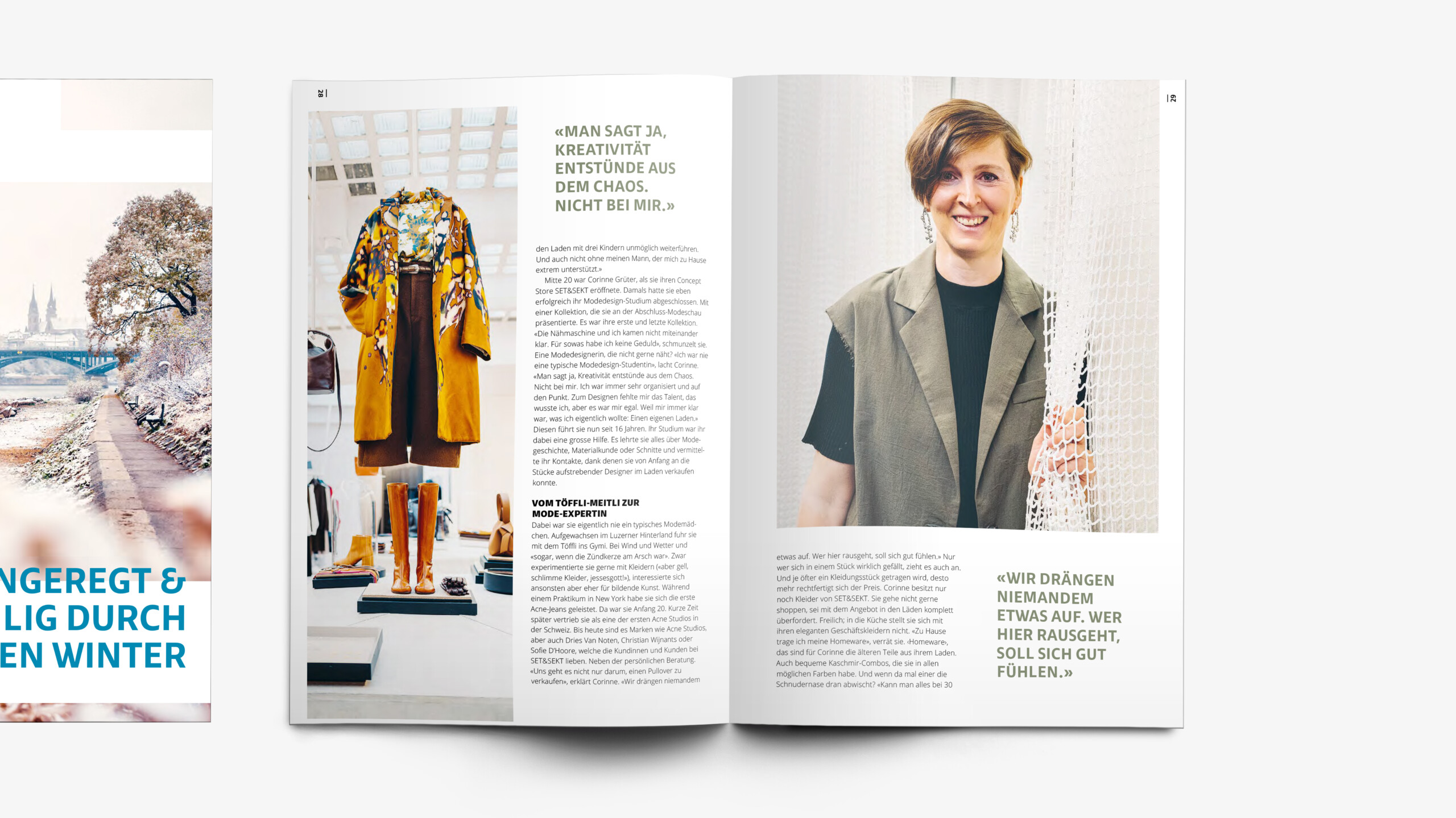 Es läuft bei Corinne Grüter. Die Inhaberin von SET&SEKT hat eben ihr drittes Kind geboren. Nun erzählt sie frisch und fröhlich, wie sie mit Schnuder auf Kaschmir umgeht, was an ihr spiessig ist und warum sie niemals wieder eine Kollektion nähen wird.