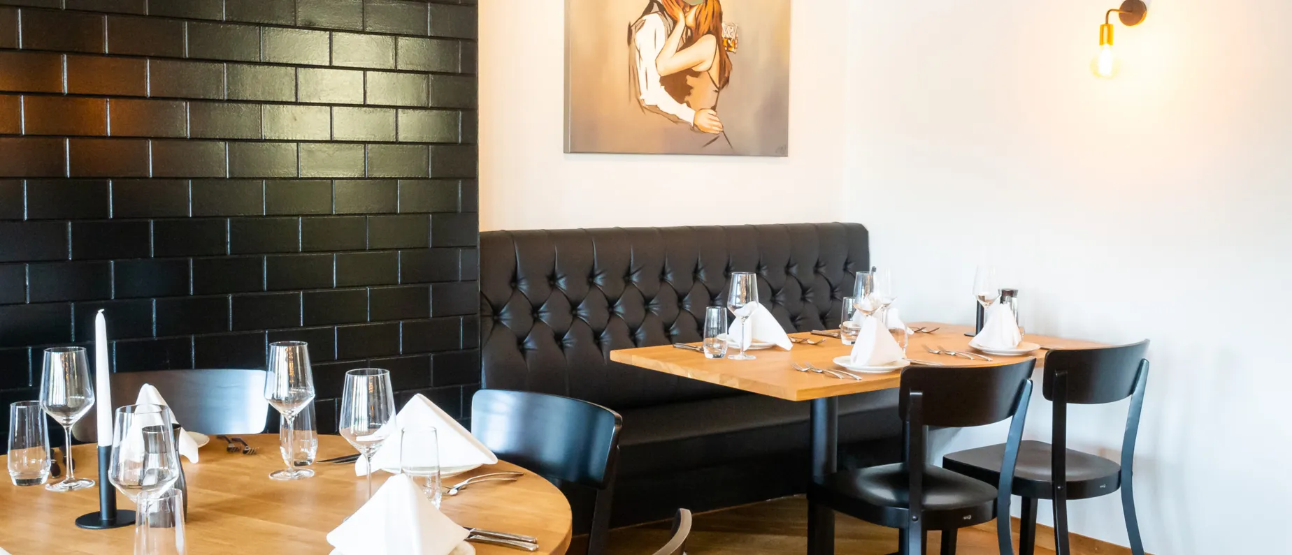 Der Name der Basler Traditionsbeiz schräg unterhalb des @Grand Hotel LES TROIS ROIS wurde beibehalten, ansonsten erscheint der «Vierte König» nun in neuem Look. Jünger, urbaner, frecher und moderner wirst du nun empfangen, wenn du die fast schon versteckte Treppe vom Blumenrain zum Restaurant hinuntersteigst und das neu umgebaute Lokal betrittst. Die mit schwarzen Backsteinen verkleideten Wände in Kombination mit den schönen Holztischen und den gemalten Gemälden von eng umschlungenen Paaren im modischen 20er-Jahre-Style sorgen dabei für einen Hauch von Mafia. Geheimnisvoll, verführerisch, genussliebend.