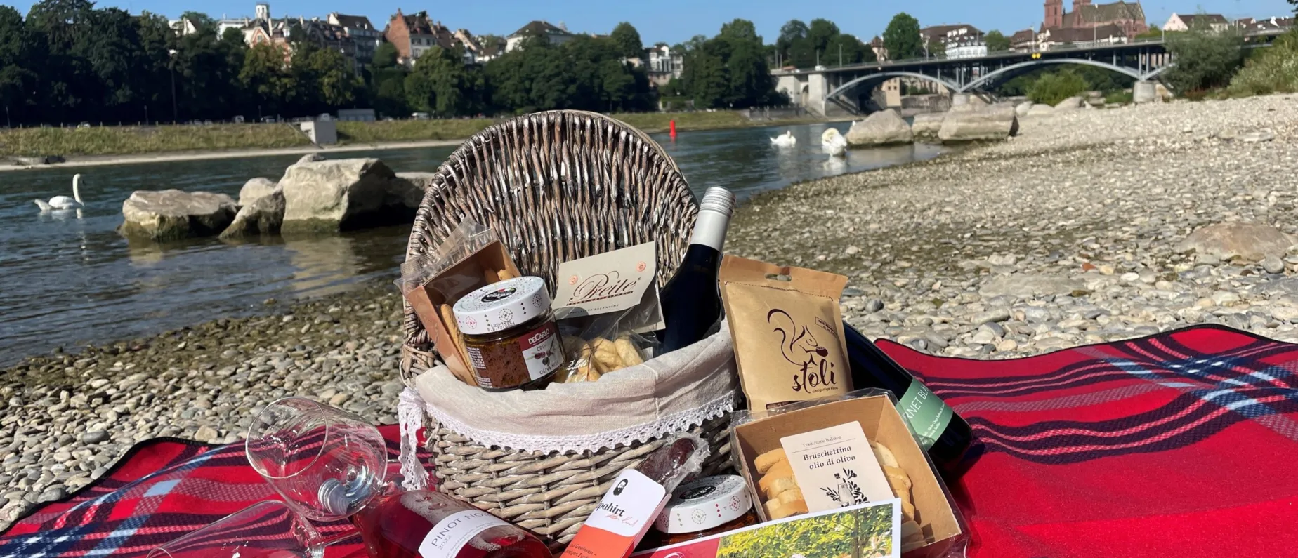 Dazu gehören auch allerlei Apéro-Snacks und Knabbereien, um deinen Hunger und Gluscht zu stillen. Die Picknick-Decke, die Weingläser, den Flaschenöffner und die Kühlelemente sind zudem unverzichtbar für einen entspannten Nachmittag oder Abend am Rhein und gibt's ebenfalls gleich zum Picknick-Korb mitgeliefert.
