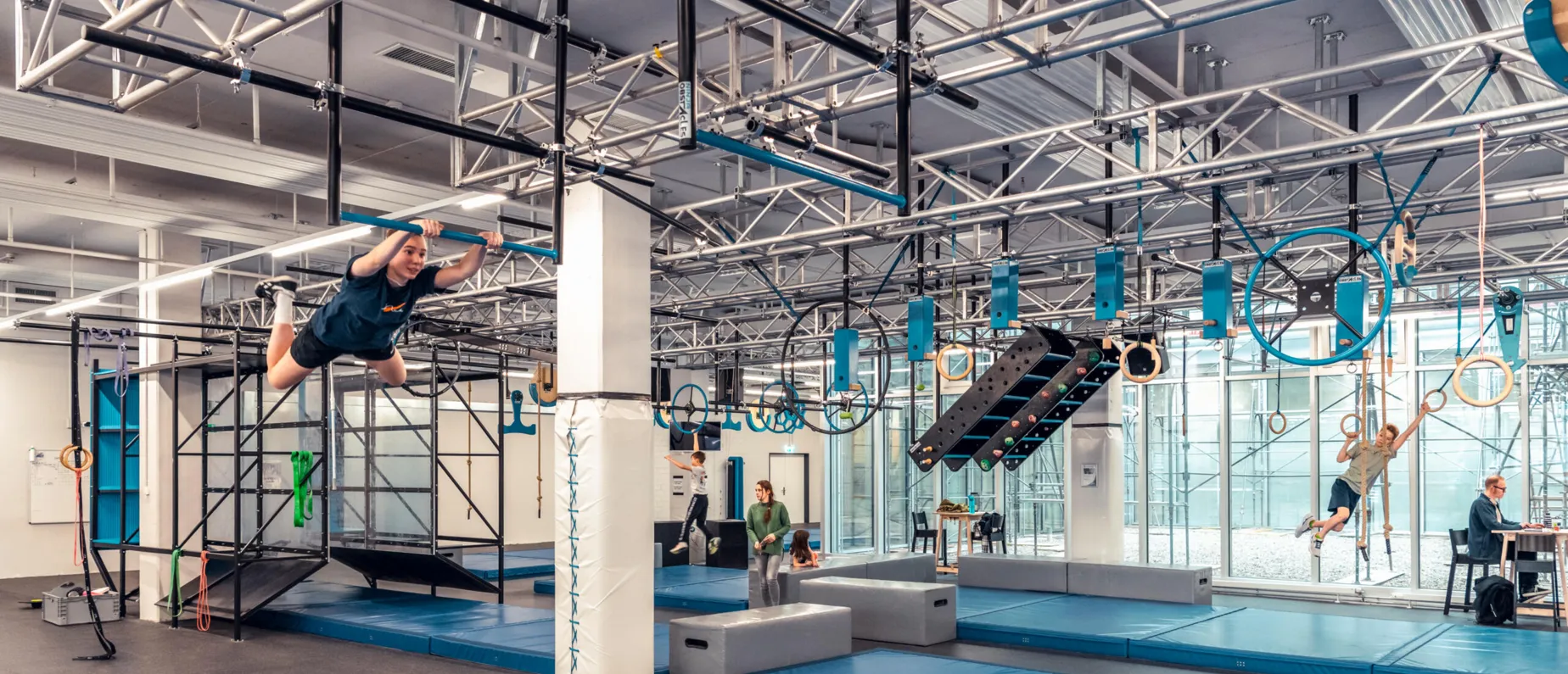 Unter ihnen auch Christian Harmat, der 2019 den Parkour Weltcup in der Kategorie Speed gewonnen hat und einer der schnellsten Freerunner der Welt ist. In Eiltempo überwindet Chris in seinen Videos quasi die Schwerkraft, fliegt die Wände hoch, um von einer Dachkante auf die nächste zu springen oder mit einem seitlichen Doppelsalto in den Rhein. Das fasziniert nicht nur Kids, da halten auch viele Erwachsene den Atem an. Neben Chris gibt auch Andrea Messner ihr Wissen in Workshops weiter. Andrea hat 2022 den Ninja Warrior Germany gewonnen, ist also last standing woman. Unter der Leitung solcher Profis entstehen natürlich neue Profis. So hat das Overground mittlerweile ein eigenes Ninja competition Team mit 20 Kindern zwischen 8-18 Jahren, die mit ihren Vorbildern trainieren und von ihnen Tipps aus erster Hand erhalten. An den hauseigenen Overground (OG) Games, bei denen sich Athleten aus ganz Europa messen, können sie dann erste Wettkampfluft schnuppern.