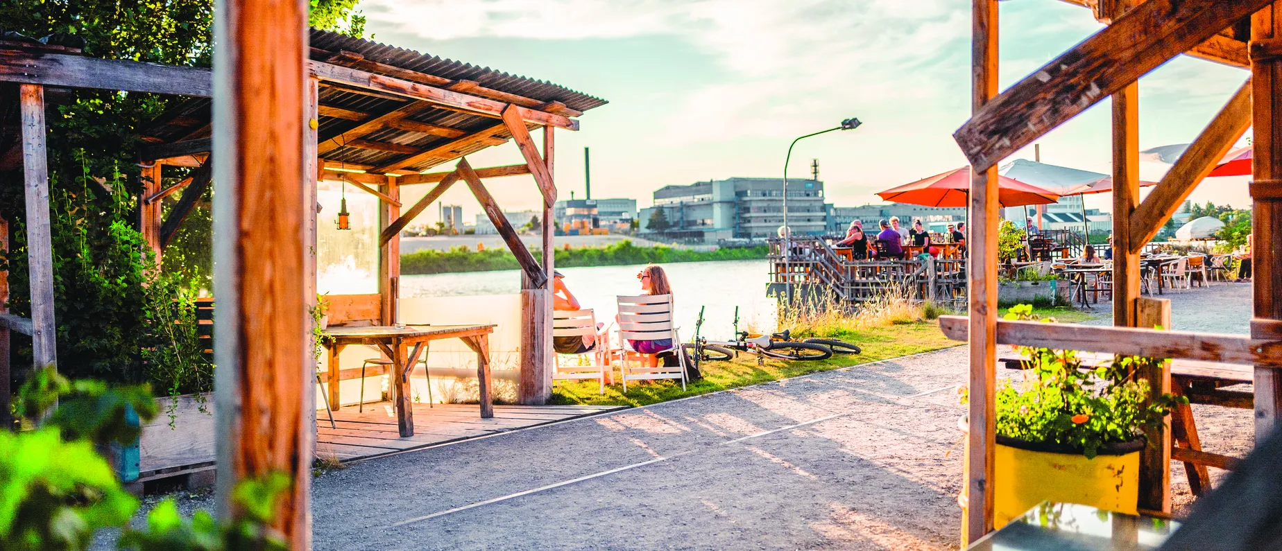 Aushängeschild vom alten Hafen ist und bleibt die Landestelle. Wer in einem der Holzhäuschen Platz genommen hat, darf die Beine strecken und braucht sich nur noch zu entscheiden; zwischen Panini, der legendären Grillplatte zum Teilen und Negroni zum Beispiel. Am besten nimmst du gleich alles. Denn spätestens beim Blick auf Rhein, Sonnenuntergang und das scheinbare Ägypten (die «Pyramiden» von Novartis) wird deutlich, wieso es mehr als richtig ist, hier zu landen.