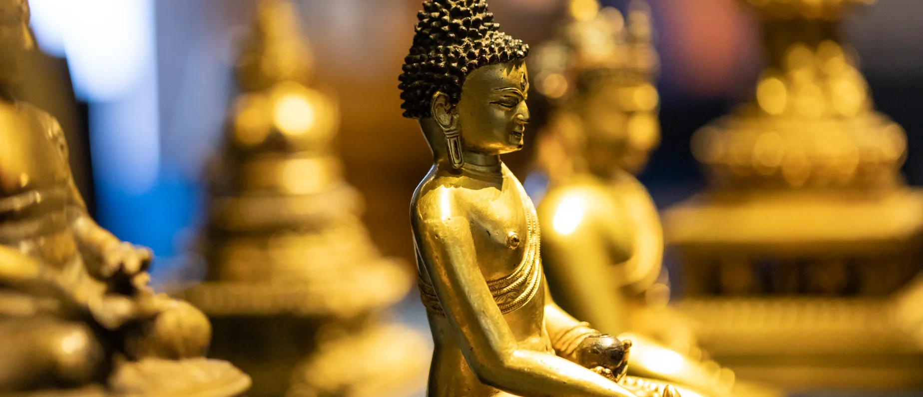 Die zweite Station der Ausstellung richtet den Fokus auf die buddhistische Lehre, Dharma, und zeigt auf, wie die Praktizierenden auf dem Weg zur Erleuchtung von Lehrerinnen und Lehrern begleitet und unterrichtet werden. Was dich sogleich zur dritten Station führt: die Gemeinschaft, Sangha. Diese verbreitet die buddhistische Lehre. Hier geben verschiedene Gegenstände Auskunft über die religiöse Praxis – vom Reisealtar und Gebetszylinder bis zu Ritualgeräten und Opfergaben bietet dir die Ausstellung eine spannende Übersicht.