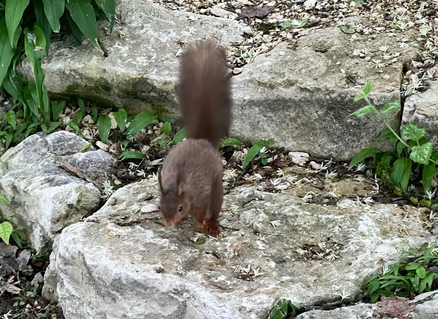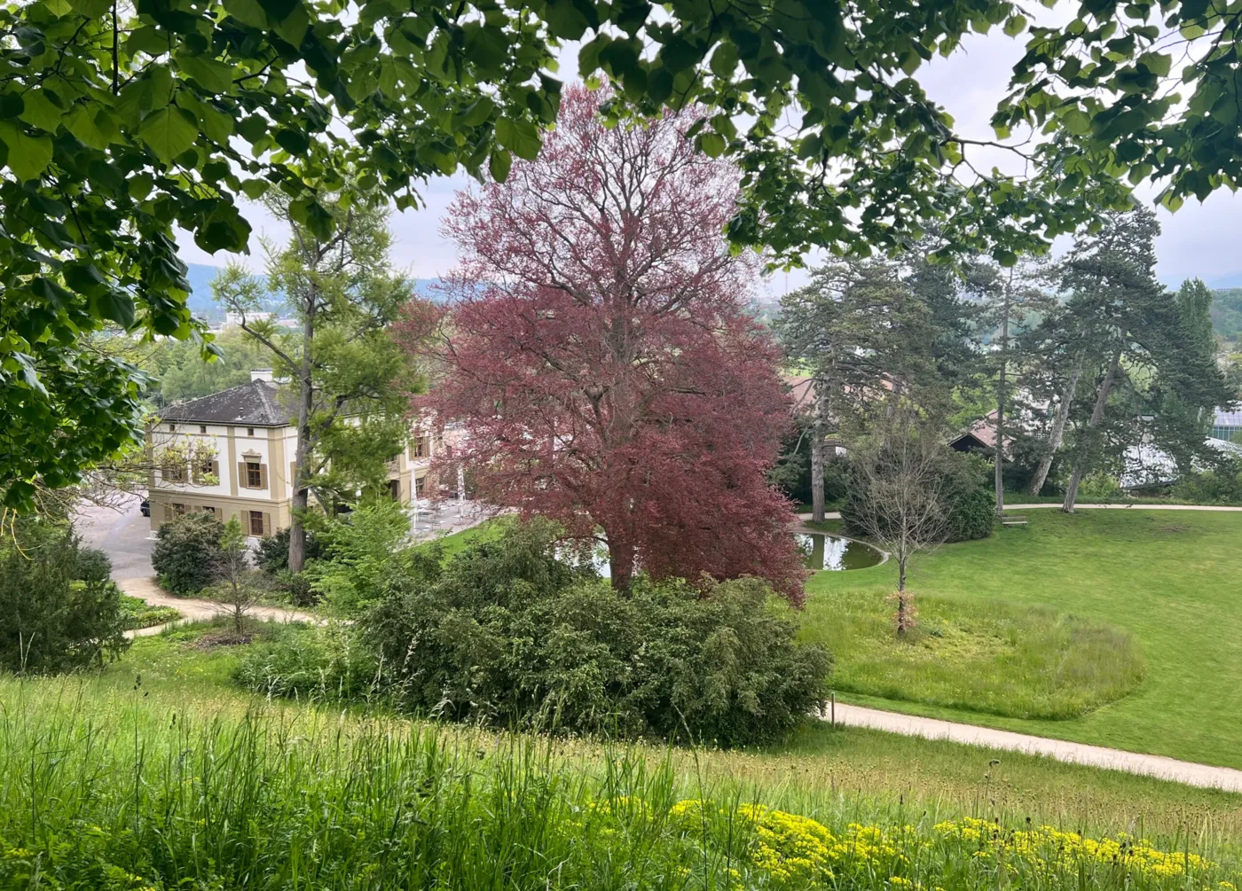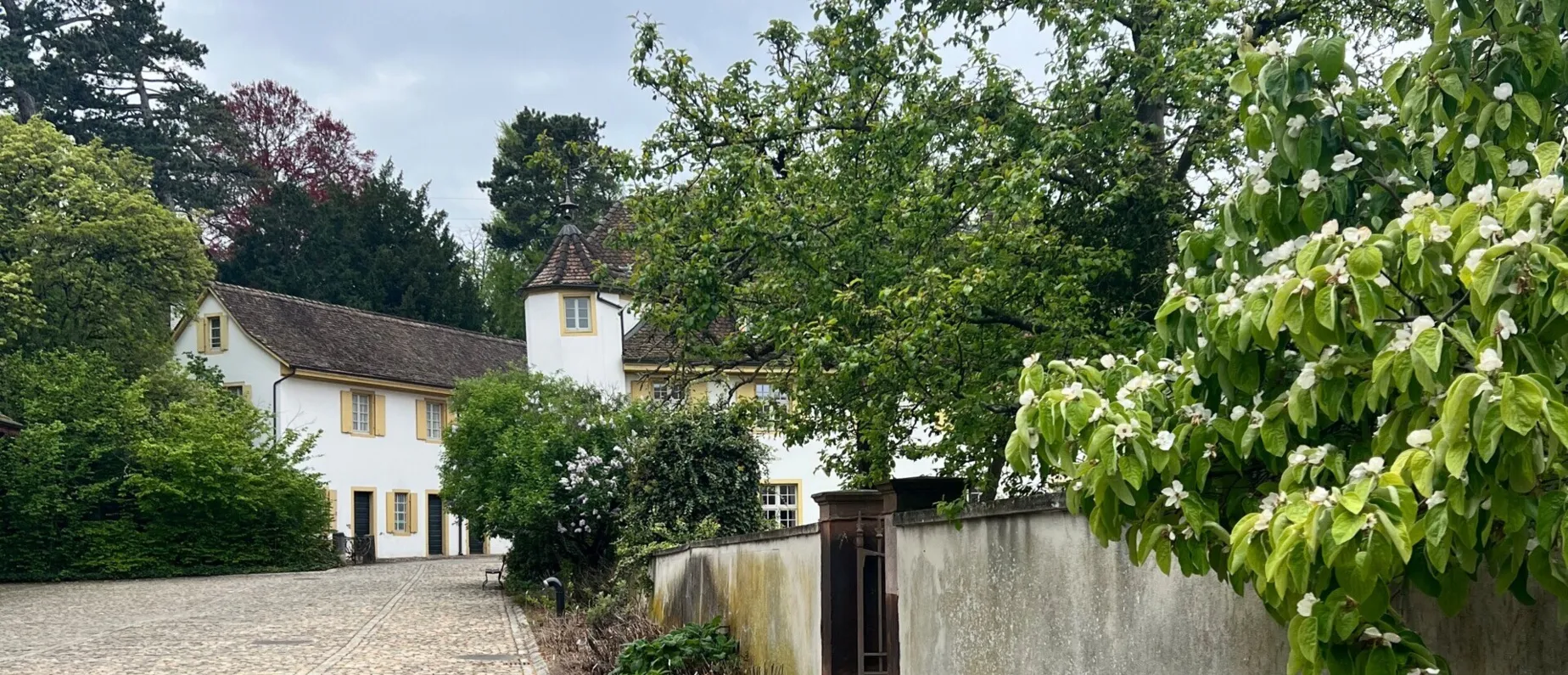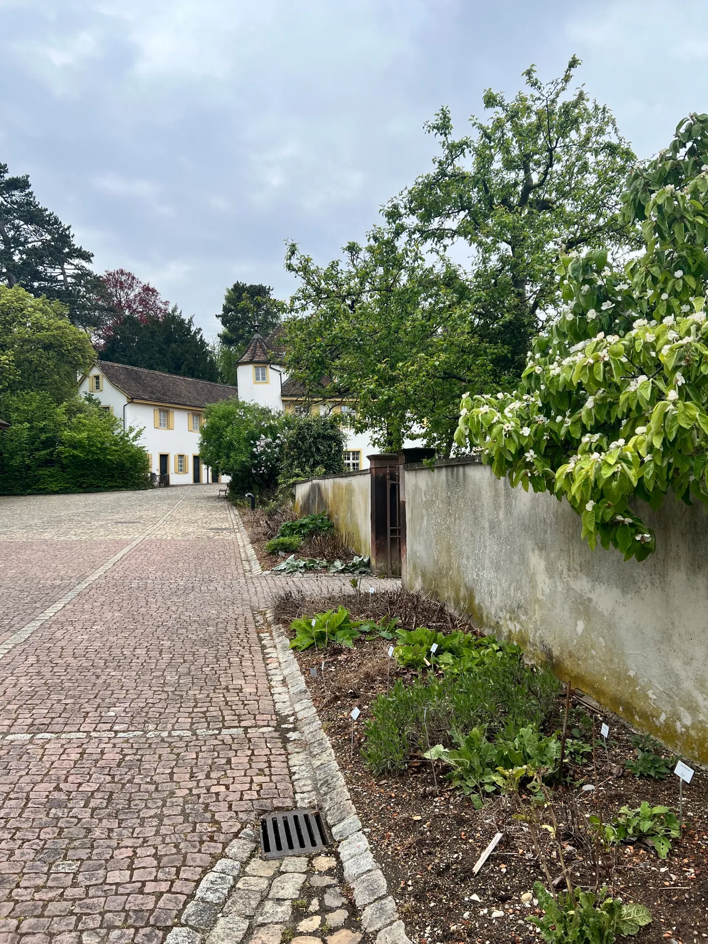 Der Stimme durch die Gärten folgend höre ich Kühe muhen, Störche klappern, Bienen summen, Pferde schnauben. Hin und wieder sanfte Musik. Kindergeplapper. Schritte. Die tatsächlichen Geräusche des morgendlichen Treibens auf dem Areal vermischen sich mit der Tonspur auf meinen Ohren. Ich höre von feinstofflichen Wesen und Luftgeistern. Von Dachsen, die im Park leben und vom Ehepaar Merian, das die Villa samt 50 Hektaren Umschwung zur Hochzeit geschenkt bekam und sie als Sommerresidenz nutzte.
