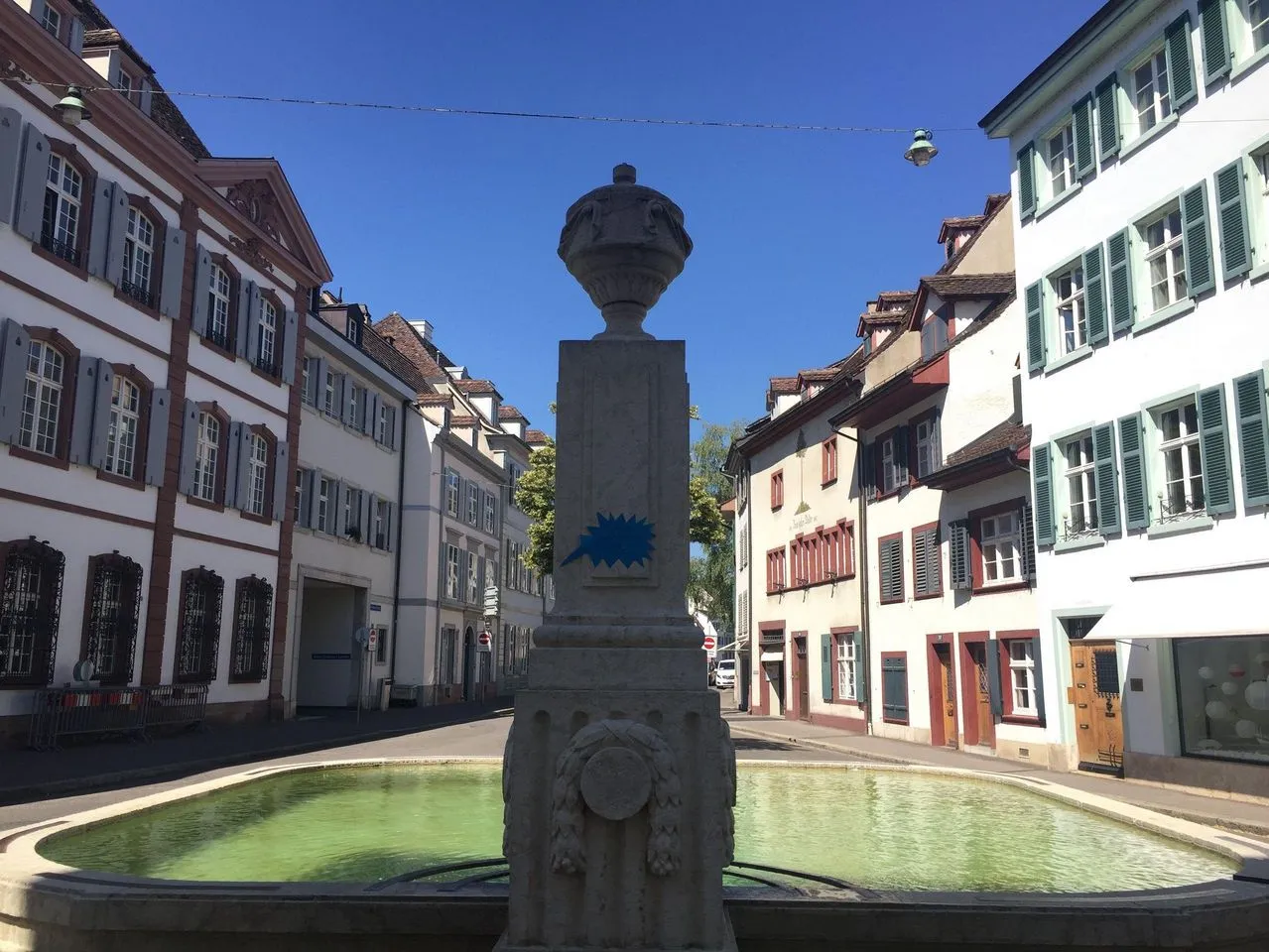 Brunnen am Rümelinsplatz: Zentral gelegen, sonnig und umgeben von Cafés – perfekt für ein entspanntes Sit-in.